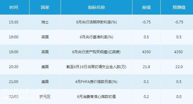 周四(6月21日)亞歐時段,投資者需關注15:30公布的瑞士6月央行活期存款利率,19:00公布的英國6月央行基準利率、及英國6月央行資產購買規模。