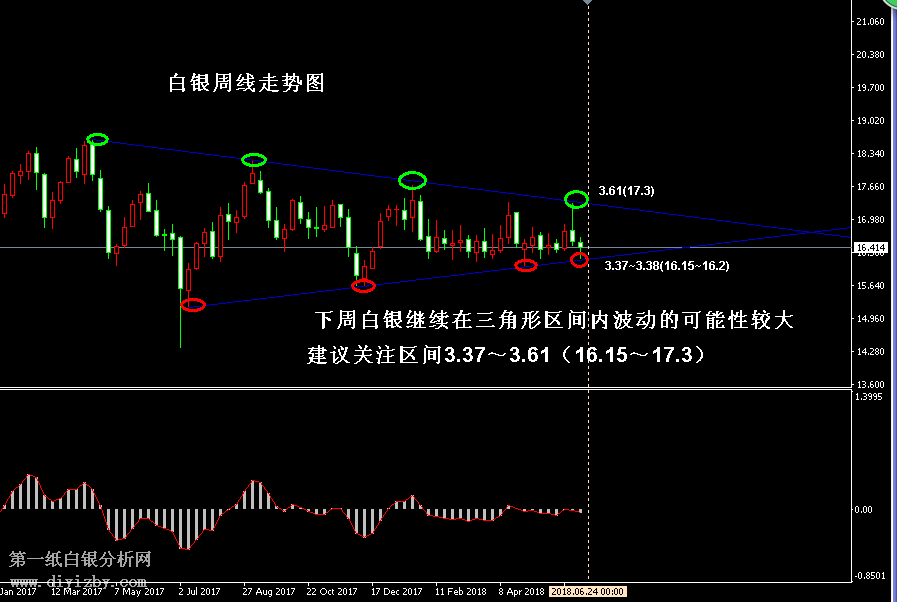 目前白銀價(jià)格是3.434克(16.414美元)。本周銀價(jià)先跌后漲,在觸及震蕩區(qū)間強(qiáng)支撐和周線三角形下沿后,走勢(shì)迎來了反彈行情,一方面說明銀價(jià)當(dāng)前所處的格局仍然為震蕩區(qū)間內(nèi)波動(dòng),另一方面說明在區(qū)間強(qiáng)支撐附近再次發(fā)生了多空力量轉(zhuǎn)變的情況。如下圖所示為白銀周線走勢(shì)圖,圖中藍(lán)線所示為在過去一年時(shí)間里白銀高點(diǎn)和低點(diǎn)所形成的下跌趨勢(shì)線和上升趨勢(shì)線,該趨勢(shì)線的效力非常明顯,在過去幾個(gè)月的震蕩行情中,走勢(shì)一直處于上述趨勢(shì)線所形成的“收縮三角形”范圍內(nèi)震蕩。上周銀價(jià)曾一度拉升至三角形上沿阻力,但最終未能突破,并遭遇了明顯的空頭拋壓,銀價(jià)從下跌趨勢(shì)線開始大幅回落。直至本周,走勢(shì)一度連續(xù)下跌,但最終回踩了三角形下沿支撐后,銀價(jià)開啟了反彈行情。可以看出,當(dāng)前走勢(shì)正圍繞圖中“收縮三角形”形態(tài)來回波動(dòng),而該三角形在過往行情中對(duì)于銀價(jià)的影響亦非常明顯,綠色圈說明走勢(shì)在過去多次拉升中都遭遇了強(qiáng)壓影響,最終未能突破;紅色圈說明走勢(shì)在過去多次下跌中都遭遇了強(qiáng)買盤支撐,未能跌破。由于隨著時(shí)間推移,收縮三角形的波動(dòng)區(qū)間越來越窄,這也限制了在2018年以來,走勢(shì)大部分時(shí)間都處于區(qū)間震蕩的緣故。一方面投資者可堅(jiān)持在收縮三角形的兩端進(jìn)行高拋低吸,另一方面應(yīng)時(shí)刻關(guān)注三角形的突破情況,一旦突破后,銀價(jià)將有望順勢(shì)突破當(dāng)前的大震蕩區(qū)間3.34~3.62(16~17.35),這將為下一步趨勢(shì)行情指明方向。下周三角形下沿支撐將緩慢上移至3.37~3.38(16.15~16.2)附近,上沿阻力將緩慢下移至3.61(17.3)附近,上述支撐和阻力仍然隸屬于大區(qū)間3.34~3.62(16~17.35)范圍內(nèi),故而推測(cè)走勢(shì)繼續(xù)震蕩的可能性極大,投資者應(yīng)在上述支撐和阻力進(jìn)行高拋低吸,嚴(yán)格止損大震蕩區(qū)間外沿。值得注意的是,目前價(jià)格正靠近三角形下沿支撐附近,故而下周初投資者應(yīng)先嘗試回落做多的思路,等待銀價(jià)反彈遇阻后再嘗試反手做空。雖然近期走勢(shì)連續(xù)下跌,但從形態(tài)上來分析,銀價(jià)并未轉(zhuǎn)入下跌趨勢(shì),也未能向下打開空間,在走勢(shì)跌破震蕩區(qū)間之前,投資者絕不可過分看空。綜合分析,近兩周的走勢(shì)正是在圖中收縮三角形的上沿和下沿來回波動(dòng),上周銀價(jià)沖擊綠色圈所示的上沿壓力而回落,本周走勢(shì)又回踩了紅色圈所示的下沿支撐而反彈。下周開盤后,銀價(jià)仍將處于三角形范圍內(nèi)波動(dòng),且非常靠近三角形下沿支撐3.37~3.38(16.15~16.2),投資者可圍繞該支撐上方布局多單,止損在震蕩區(qū)間底部3.34(16)下方。除非銀價(jià)跌破3.34(16),否則行情不能向下打開空間,此時(shí)走勢(shì)的反彈意圖和空間將更大(看至區(qū)間上沿阻力)。投資者應(yīng)先做多,等待反彈后再做空,保持區(qū)間內(nèi)來回高拋低吸的思路。(注: 由于紙白銀價(jià)格是國 際銀價(jià)換算而來,而換算過程中涉及到人民幣對(duì)美元匯率的變化,即使在國際銀價(jià)不變化的情 況下,如果人民幣貶值或升值,也會(huì)導(dǎo)致紙白銀價(jià)格出現(xiàn)變動(dòng)。因此,我們的分析只采用最新 的國際銀價(jià)對(duì)應(yīng)的人民幣白銀價(jià)格,如與過去分析價(jià)格有出入, 投資者應(yīng)知曉其原因。)