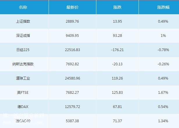 道瓊斯指數周五收盤上漲119.26點,漲幅0.49%,報24580.96點;標普500指數周五收盤上漲5.13點,漲幅0.19%,報2754.89點;納斯達克指數周五收盤下跌20.13點,跌幅0.26%,報7692.82點。