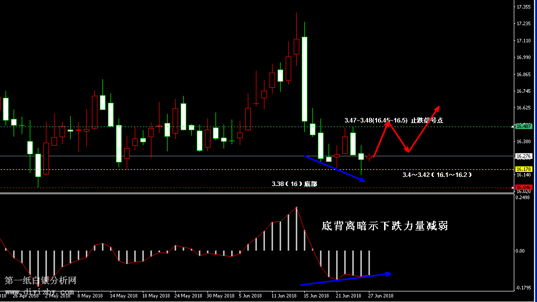 今日下方關鍵支撐3.4~3.42(16.1~16.2)、3.38(16);今日上方關鍵阻3.54(16.75)、3.6~3.63(17.05~17.2)、3.66(17.35)。 提示:技術僅僅是基于概率論和統(tǒng)計學的一種綜合分析手段,絕非預測。所以技術分析是在考慮做好止損的情況下去博取大概率事件,投資不可過于迷信技術分析。(短線操作請一定做好止損,一旦被損,代表分析師基于概率和統(tǒng)計的技術分析不適用于當前行情) 另外,由于紙白銀價格是國際銀價換算而來,而換算過程中涉及到人民幣對美元匯率的變化,即使在國際銀價不變化的情況下,如果人民幣貶值或升值,也會導致紙白銀價格出現(xiàn)變動。因此,我們的分析只采用最新的國際銀價對應的人民幣白銀價格,如與過去分析價格有出入, 投資者應知曉其原因。 1、文中價格為紙白銀價格,括號內(nèi)為國際銀價,投資者可雙向參考。 2、以上所有價格為工商銀行買入價,即紙白銀低價。進倉點位要再加點差(各銀行點差不一),出倉則不要。 3、第一紙白銀給出的所有建議僅供投資者參考,不作為下單絕對依據(jù),切勿過于依賴。 4、北京時間09:00發(fā)布此文章。 5、上一交易日白銀價格分析情況:(6月26日)白銀多頭蓄力守穩(wěn)支撐 關注強弱信號突破