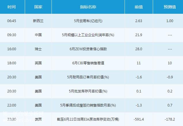 美盤時段,關注20:30公布的美國5月耐用品訂單月率初值、美國5月批發庫存月率初值,22:00的美國5月季調后成屋簽約銷售指數月率,以及22:30的美國EIA原油庫存變動。