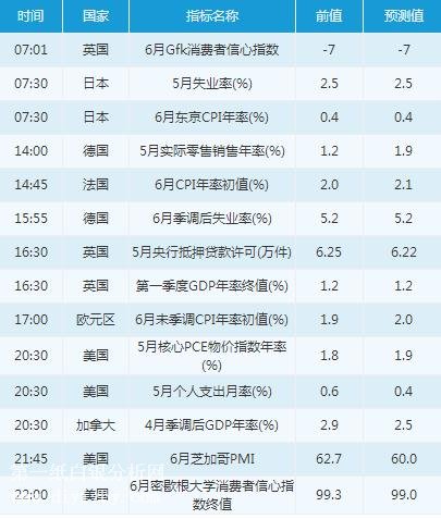 周五(6月29日)亞盤時段,投資者需關(guān)注07:01公布的英國6月Gfk消費者信心指數(shù),07:30公布的日本5月失業(yè)率、日本6月東京CPI年率。