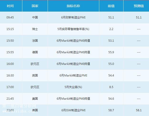 美盤時(shí)段,關(guān)注21:45公布的美國6月Markit制造業(yè)PMI終值,22:00公布的美國6月ISM制造業(yè)PMI。
