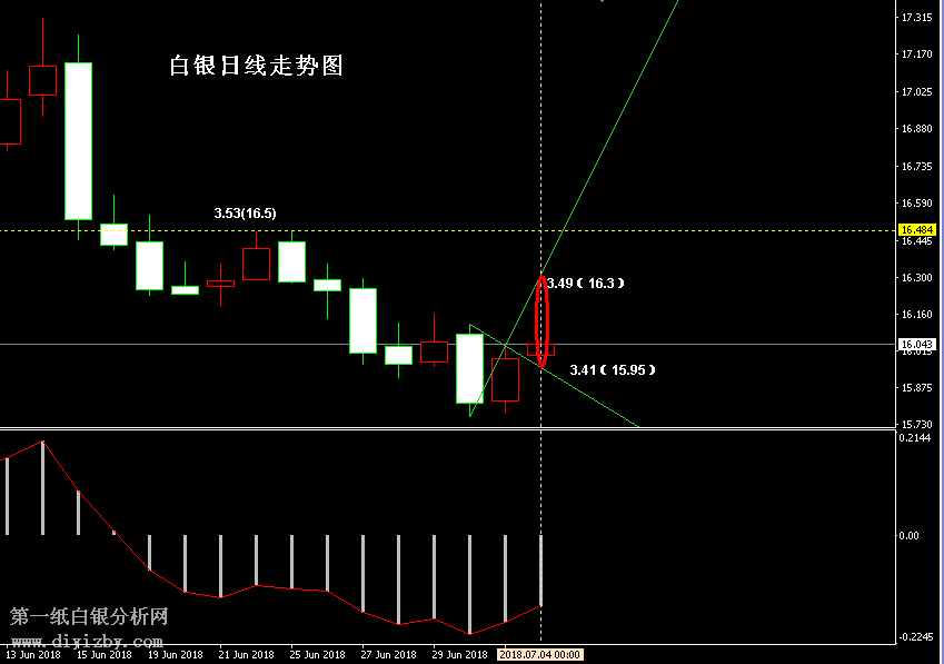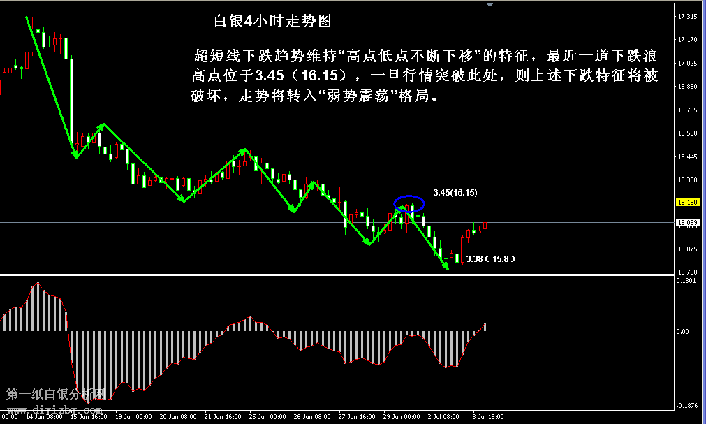 今日下方關鍵支撐3.38(15.8)、3.25(15.25);今日上方關鍵阻3.43(16.05)、3.45(16.15)、3.53(16.5)、3.58(16.75)、3.64~3.67(17.05~17.2)、3.71(17.35)。 提示:技術僅僅是基于概率論和統計學的一種綜合分析手段,絕非預測。所以技術分析是在考慮做好止損的情況下去博取大概率事件,投資不可過于迷信技術分析。(短線操作請一定做好止損,一旦被損,代表分析師基于概率和統計的技術分析不適用于當前行情) 另外,由于紙白銀價格是國際銀價換算而來,而換算過程中涉及到人民幣對美元匯率的變化,即使在國際銀價不變化的情況下,如果人民幣貶值或升值,也會導致紙白銀價格出現變動。因此,我們的分析只采用最新的國際銀價對應的人民幣白銀價格,如與過去分析價格有出入, 投資者應知曉其原因。 1、文中價格為紙白銀價格,括號內為國際銀價,投資者可雙向參考。 2、以上所有價格為工商銀行買入價,即紙白銀低價。進倉點位要再加點差(各銀行點差不一),出倉則不要。 3、第一紙白銀給出的所有建議僅供投資者參考,不作為下單絕對依據,切勿過于依賴。 4、北京時間09:00發布此文章。 5、上一交易日白銀價格分析情況:(7月3日)白銀未止跌但觸及支撐位 關注走勢反彈力度