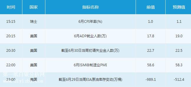 美國時段,投資者需關注20:15公布的美國6月ADP就業人數、20:30公布的美國截至6月30日當周初請失業金人數、以及22:00美國6月ISM非制造業PMI。此后,投資者還需密切關注23:00公布的美國截至6月29日當周EIA原油庫存變動、以及次日02:00美聯儲FOMC將公布6月政策會議紀要。