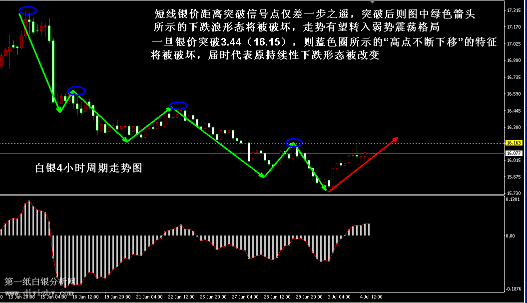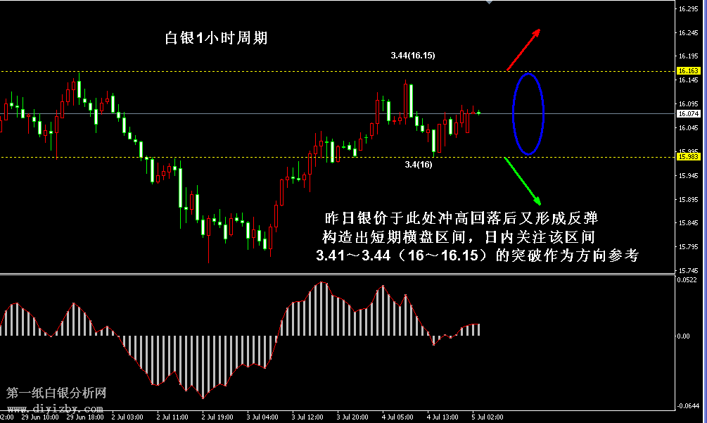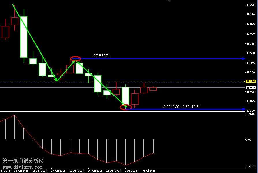 今日下方關鍵支撐3.36(15.8)、3.24(15.25);今日上方關鍵阻3.44(16.15)、3.51(16.5)、3.56(16.75)、3.62~3.65(17.05~17.2)、3.69(17.35)。 提示:技術僅僅是基于概率論和統計學的一種綜合分析手段,絕非預測。所以技術分析是在考慮做好止損的情況下去博取大概率事件,投資不可過于迷信技術分析。(短線操作請一定做好止損,一旦被損,代表分析師基于概率和統計的技術分析不適用于當前行情) 另外,由于紙白銀價格是國際銀價換算而來,而換算過程中涉及到人民幣對美元匯率的變化,即使在國際銀價不變化的情況下,如果人民幣貶值或升值,也會導致紙白銀價格出現變動。因此,我們的分析只采用最新的國際銀價對應的人民幣白銀價格,如與過去分析價格有出入, 投資者應知曉其原因。 1、文中價格為紙白銀價格,括號內為國際銀價,投資者可雙向參考。 2、以上所有價格為工商銀行買入價,即紙白銀低價。進倉點位要再加點差(各銀行點差不一),出倉則不要。 3、第一紙白銀給出的所有建議僅供投資者參考,不作為下單絕對依據,切勿過于依賴。 4、北京時間09:00發布此文章。 5、上一交易日白銀價格分析情況:(7月4日)白銀反彈沖擊止跌信號點 突破后將轉入震蕩