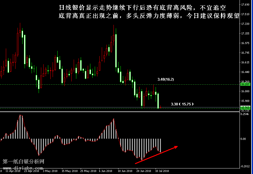 今日下方關(guān)鍵支撐3.38(15.75)、3.28(15.25);今日上方關(guān)鍵阻3.46(16.1)、3.5~3.52(16.3~16.4)、3.54(16.5)。 提示:技術(shù)僅僅是基于概率論和統(tǒng)計(jì)學(xué)的一種綜合分析手段,絕非預(yù)測(cè)。所以技術(shù)分析是在考慮做好止損的情況下去博取大概率事件,投資不可過(guò)于迷信技術(shù)分析。(短線操作請(qǐng)一定做好止損,一旦被損,代表分析師基于概率和統(tǒng)計(jì)的技術(shù)分析不適用于當(dāng)前行情) 另外,由于紙白銀價(jià)格是國(guó)際銀價(jià)換算而來(lái),而換算過(guò)程中涉及到人民幣對(duì)美元匯率的變化,即使在國(guó)際銀價(jià)不變化的情況下,如果人民幣貶值或升值,也會(huì)導(dǎo)致紙白銀價(jià)格出現(xiàn)變動(dòng)。因此,我們的分析只采用最新的國(guó)際銀價(jià)對(duì)應(yīng)的人民幣白銀價(jià)格,如與過(guò)去分析價(jià)格有出入, 投資者應(yīng)知曉其原因。 1、文中價(jià)格為紙白銀價(jià)格,括號(hào)內(nèi)為國(guó)際銀價(jià),投資者可雙向參考。 2、以上所有價(jià)格為工商銀行買入價(jià),即紙白銀低價(jià)。進(jìn)倉(cāng)點(diǎn)位要再加點(diǎn)差(各銀行點(diǎn)差不一),出倉(cāng)則不要。 3、第一紙白銀給出的所有建議僅供投資者參考,不作為下單絕對(duì)依據(jù),切勿過(guò)于依賴。 4、北京時(shí)間09:00發(fā)布此文章。 5、上一交易日白銀價(jià)格分析情況:(7月11日)白銀陷入弱勢(shì)震蕩區(qū)間 等待進(jìn)一步方向選擇