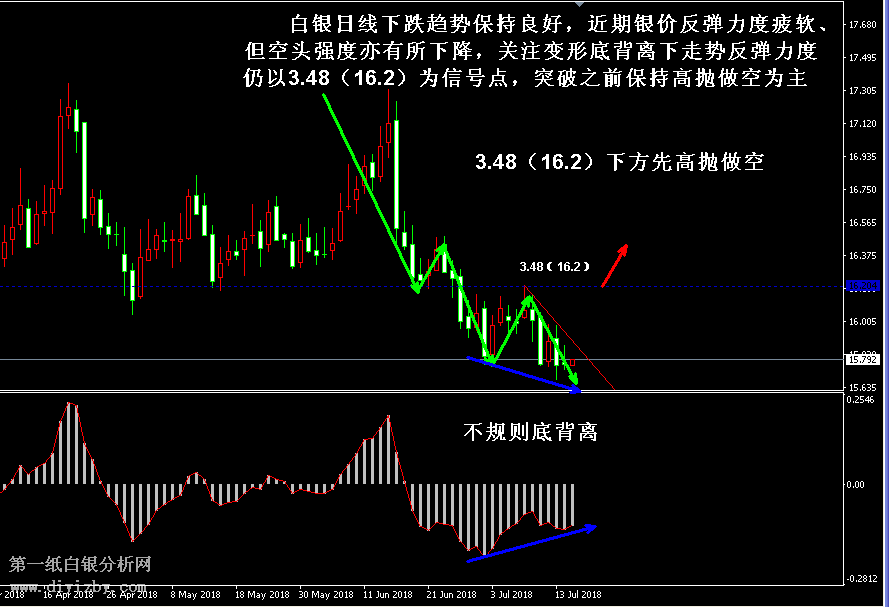 目前白銀價格是3.391元/克(15.80美元/盎司)。昨日銀價反彈后再度回落,近期走勢出現了連續陰跌的行情,這說明多頭力量依舊疲軟,不過當前行情中空頭力量亦明顯減弱,走勢并未出現大幅下跌的現象,僅僅是圍繞支撐位3.38~3.39(15.75~15.8)附近進行徘徊。在銀價未真正止跌企穩之前,日內投資者可一邊嘗試反彈做空,另一方面密切關注走勢的反彈力度,仍以日線前浪高點3.48(16.2)作為判斷銀價止跌企穩的信號點。如下圖所示為白銀日線走勢圖,單從趨勢角度來分析,如圖中綠色箭頭所示,當前銀價正維持良好的下跌格局,投資者可順應此趨勢嘗試反彈分批布局空單。圖中所示下跌趨勢的前浪高點位于藍線處的3.48(16.2)附近,只要近期銀價反彈不突破該點位,則綠色箭頭所示的下跌形態將始終延續,此種情況下白銀將有望順應趨勢不斷下行,投資者應保持高拋做空為主。今日受到圖中紅線所示的日切線壓制,日內銀價反彈后的阻力位在3.41(15.9)附近,其次是趨勢阻力3.46(16.1),投資者可分批在上述兩線壓力位做空,統一止損高點3.48(16.2)上方。值得注意的是,由于當前銀價并未出現有效反彈,且形態上也未能顯示出止跌企穩的跡象,故而投資者暫不可提前做多,日內需密切關注走勢反彈對于3.48(16.2)的突破情況,一旦銀價突破此處后,行情將打破綠色箭頭所示的下跌形態,屆時銀價有望轉入震蕩格局,投資者方可進行高拋低吸的策略。當前白銀在跌破支撐位3.38~3.39(15.75~15.8)后,未顯示出多頭力量復蘇的跡象,但走勢形態中出現了“不規則底背離”現象(圖中藍色箭頭),即價格創出新低后,動能指標未能較前浪低點創出新低(但上周五價格創新低后,較周四低點的動能指標更低),因此,近期行情形成了“不規則底背離”形態。目前該底背離尚未能驗證其有效性,投資者可配合銀價突破3.48(16.2)前浪高點作為統一判斷走勢止跌企穩的信號,若該底背離無法令行情出現有效反彈,則最終投資者可完全忽略其存在,繼續順勢做空。因此,日內投資者應先順應趨勢高拋做空,僅當銀價突破3.48(16.2)打破下跌趨勢且確認底背離后方可低吸做多,其余情況保持分批布局空單策略為宜。綜合分析:近期白銀連續創出新低后,雖然空頭力量正有所減弱,但多頭未見任何復蘇跡象,此種情況下需謹防銀價小幅震蕩后又再創新低的風險。若多頭無法轉強,則走勢亦不會打破下跌趨勢,行情將依靠趨勢慣性延續下跌。
