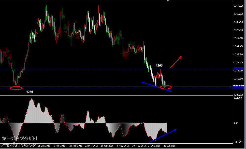 白銀短線策略:(波段:持倉觀望;短線:高拋做空)。 黃金的走勢形態與白銀相似,近期在創出新低后同樣出現了“底背離”形態,但在該底背離作用下,金價的反彈力度仍然薄弱,尚未驗證多頭復蘇的有效性,若進一步跌破雙底支撐位1236,則空頭有望增強。如下圖所示為黃金日線走勢圖,圖中藍色箭頭顯示出金價在近期出現了明顯的底背離形態,這說明空頭力量有所減弱,投資者應關注此背景下多頭的復蘇狀態。以黃金前浪高點1266為信號點,當金價有效突破該點位后,則上述底背離形態確認成立,同時圖中紅色圈所示的中期雙底形態宣告有效,屆時金價將打破原有下跌趨勢,首先轉入震蕩格局。上述情況與白銀的走勢形態相似,也是投資者密切關注的參考信號之一。在突破之前,應先順應原有趨勢做空,嚴格止損各自前浪高點上方。