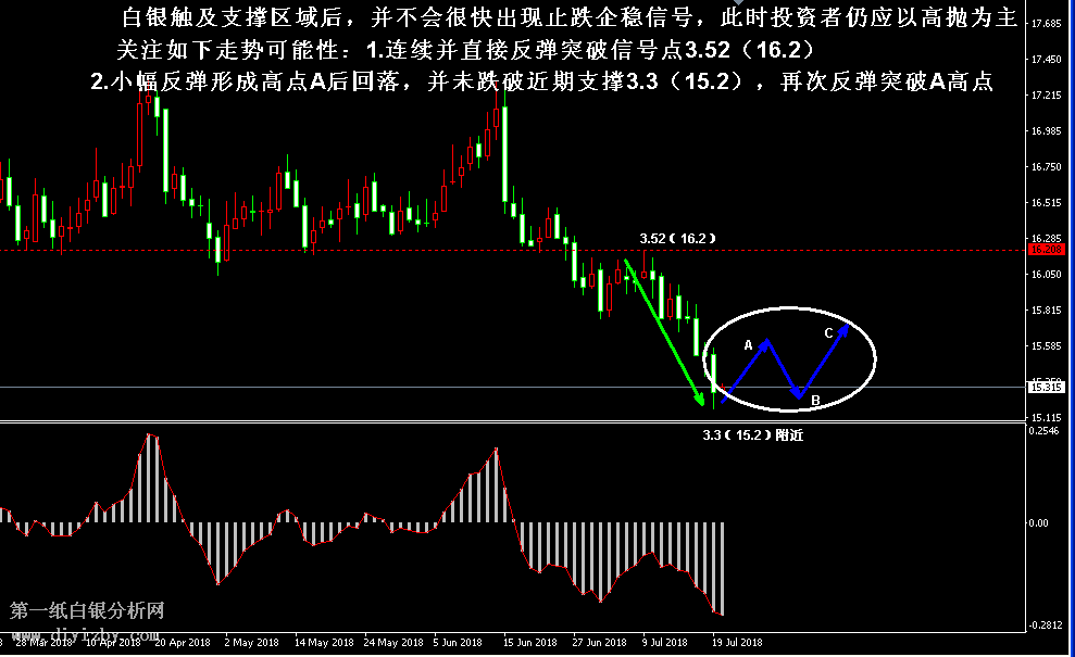 今日下方關鍵支撐3.3(15.2);今日上方關鍵阻3.4(15.65)、3.47~3.48(15.95~16)、3.52(16.2)。 提示:技術僅僅是基于概率論和統計學的一種綜合分析手段,絕非預測。所以技術分析是在考慮做好止損的情況下去博取大概率事件,投資不可過于迷信技術分析。(短線操作請一定做好止損,一旦被損,代表分析師基于概率和統計的技術分析不適用于當前行情) 另外,由于紙白銀價格是國際銀價換算而來,而換算過程中涉及到人民幣對美元匯率的變化,即使在國際銀價不變化的情況下,如果人民幣貶值或升值,也會導致紙白銀價格出現變動。因此,我們的分析只采用最新的國際銀價對應的人民幣白銀價格,如與過去分析價格有出入, 投資者應知曉其原因。 1、文中價格為紙白銀價格,括號內為國際銀價,投資者可雙向參考。 2、以上所有價格為工商銀行買入價,即紙白銀低價。進倉點位要再加點差(各銀行點差不一),出倉則不要。 3、第一紙白銀給出的所有建議僅供投資者參考,不作為下單絕對依據,切勿過于依賴。 4、北京時間09:00發布此文章。 5、上一交易日白銀價格分析情況:(7月19日)白銀走勢仍未止跌企穩 反彈后料將繼續探底