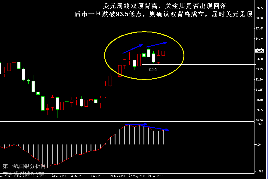 白銀短線策略:(波段:持倉觀望;短線:高拋做空)。 雖然銀價首次觸及支撐后反彈力度疲軟,但此處仍然是行情可能止跌企穩的點位之一,投資者應密切關注。另外,美元指數經歷昨日拉升后,在周線形態中出現二次頂背離風險,一旦美元因此而沖高回落,則將確認中期下跌態勢,這對于白銀圍繞3.3(15.2)的企穩具有重要意義。如下圖所示為美元指數周線走勢圖,圖中藍色箭頭顯示,昨日美元強勢拉升后,周線形態中出現了再次頂背離的現象,即價格創出新高后,動能指標未能跟隨創出新高,這暗示美元中期買盤力量有所減弱。值得注意的是,第一次美元頂背離曾令其發生回落,最低回踩至93.5附近,第二次頂背離出現后,投資者應關注美元是否能跌破93.5的前期低點,一旦跌破此處后,則雙背離成立,屆時宣告美元見頂,這對于金銀見底具有較大參考意義。反之,若美元指數近期仍延續走強,遲遲未能跌破93.5低點,則背離形態將不能成立,美元見頂假設形態也不復存在。