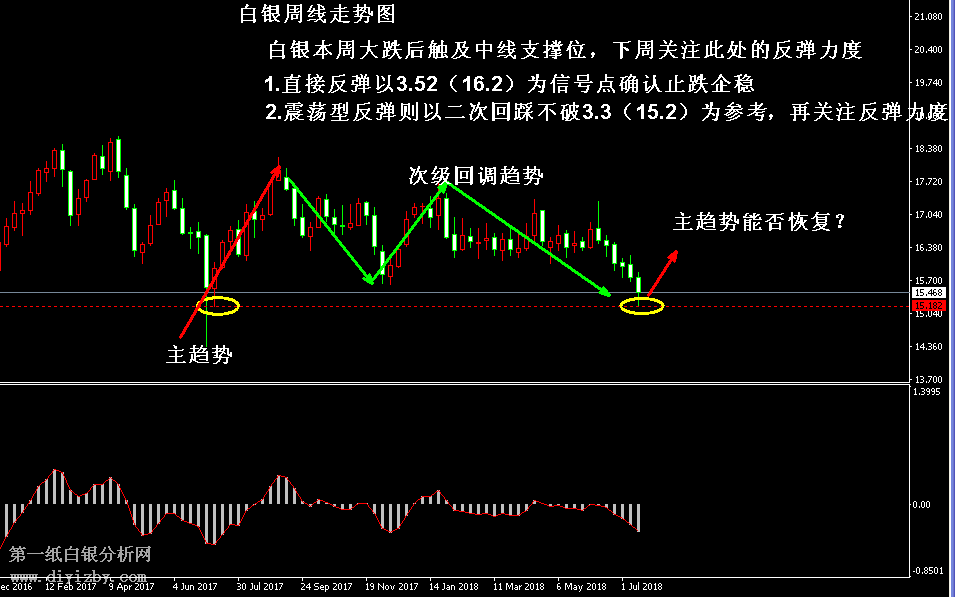目前白銀價(jià)格是3.369克(15.468美元)。本周銀價(jià)大幅下跌,最終向下回踩了中線支撐位3.3(15.2)后錄得反彈,目前短期趨勢(shì)仍處于下跌格局之中,雖然支撐位略有反彈,但當(dāng)前反彈力度尚不足以形成止跌企穩(wěn),下周投資者需密切關(guān)注支撐位3.3(15.2)所產(chǎn)生的反彈力度。如下圖所示為白銀周線走勢(shì)圖,圖中紅色箭頭所示為中期白銀的主趨勢(shì)上漲浪,綠色箭頭所示為次級(jí)回調(diào)趨勢(shì)的下跌浪,隨著本周白銀大幅下跌后,走勢(shì)已經(jīng)觸及了圖中紅色虛線所示的中長(zhǎng)線支撐位,該點(diǎn)位曾在2017年7月幫助銀價(jià)大幅上漲(黃色圈處)。目前銀價(jià)二次回踩至該點(diǎn)位后,投資者需關(guān)注此處的反彈力度能否令走勢(shì)首先企穩(wěn),而后形成再度反轉(zhuǎn)的形態(tài)。正如圖中右側(cè)紅色箭頭所示,一旦此處支撐位完成止跌反轉(zhuǎn)后,銀價(jià)有望重歸主趨勢(shì)上漲浪,屆時(shí)將順應(yīng)2017年7月的主升浪迎來(lái)反彈,因此下周投資者在3.3(15.2)被繼續(xù)跌破之前,需謹(jǐn)慎看空,當(dāng)銀價(jià)確立止跌企穩(wěn)信號(hào)后,投資者便可圍繞3.3(15.2)進(jìn)行低吸策略。值得注意的是,由于白銀價(jià)格已經(jīng)連續(xù)下跌較長(zhǎng)時(shí)間,即使行情完成了止跌企穩(wěn)形態(tài),走勢(shì)也不會(huì)立即進(jìn)入大漲格局,而是轉(zhuǎn)入震蕩的可能性較大,屆時(shí)投資者可將當(dāng)前高拋?zhàn)隹账悸忿D(zhuǎn)變?yōu)楦邟伒臀牟呗詰?yīng)對(duì)。下周投資者關(guān)注銀價(jià)能否止跌企穩(wěn)可主要參考兩大信號(hào):其一,走勢(shì)延續(xù)本周五的強(qiáng)勢(shì)反彈,一舉向上突破3.52(16.2)的日線前浪高點(diǎn),由此將直接宣告走勢(shì)完成止跌企穩(wěn),并進(jìn)入強(qiáng)勢(shì)震蕩格局;其二,走勢(shì)在區(qū)間3.3(15.2)~3.52(16.2)進(jìn)行震蕩,但震蕩中銀價(jià)回落不再跌破3.3(15.2)的中線支撐位,這將確立3.3(15.2)為短期底部的事實(shí),且反彈中形成了高點(diǎn)抬升的形態(tài),此時(shí)也可判斷走勢(shì)止跌企穩(wěn),但銀價(jià)僅僅是進(jìn)入弱勢(shì)震蕩格局,后市需仍以3.52(16.2)的突破作為行情轉(zhuǎn)入強(qiáng)勢(shì)區(qū)間的參考。綜合分析,白銀價(jià)格經(jīng)歷多周的下跌后,最終觸及了中線支撐位3.3(15.2),目前該支撐也出現(xiàn)一定反彈,但反彈力度仍需評(píng)估。在銀價(jià)二次跌破3.3(15.2)之前,投資者已經(jīng)不可過(guò)分看空當(dāng)前行情,另外,在銀價(jià)未止跌企穩(wěn)之前,投資者也不可急于抄底做多。下周操作時(shí),投資者可保持輕倉(cāng)試盤高拋低吸的策略,待出現(xiàn)進(jìn)一步信號(hào)后,可增加倉(cāng)位進(jìn)場(chǎng)。(注: 由于紙白銀價(jià)格是國(guó) 際銀價(jià)換算而來(lái),而換算過(guò)程中涉及到人民幣對(duì)美元匯率的變化,即使在國(guó)際銀價(jià)不變化的情 況下,如果人民幣貶值或升值,也會(huì)導(dǎo)致紙白銀價(jià)格出現(xiàn)變動(dòng)。因此,我們的分析只采用最新 的國(guó)際銀價(jià)對(duì)應(yīng)的人民幣白銀價(jià)格,如與過(guò)去分析價(jià)格有出入, 投資者應(yīng)知曉其原因。)