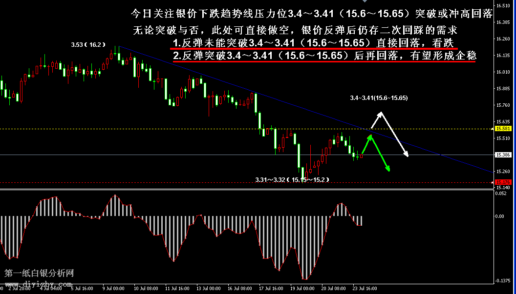 今日下方關鍵支撐3.31~3.32(15.15~15.2);今日上方關鍵阻3.4~3.41(15.6~15.65)、3.48~3.49(15.95~16)、3.53(16.2)。 提示:技術僅僅是基于概率論和統計學的一種綜合分析手段,絕非預測。所以技術分析是在考慮做好止損的情況下去博取大概率事件,投資不可過于迷信技術分析。(短線操作請一定做好止損,一旦被損,代表分析師基于概率和統計的技術分析不適用于當前行情) 另外,由于紙白銀價格是國際銀價換算而來,而換算過程中涉及到人民幣對美元匯率的變化,即使在國際銀價不變化的情況下,如果人民幣貶值或升值,也會導致紙白銀價格出現變動。因此,我們的分析只采用最新的國際銀價對應的人民幣白銀價格,如與過去分析價格有出入, 投資者應知曉其原因。 1、文中價格為紙白銀價格,括號內為國際銀價,投資者可雙向參考。 2、以上所有價格為工商銀行買入價,即紙白銀低價。進倉點位要再加點差(各銀行點差不一),出倉則不要。 3、第一紙白銀給出的所有建議僅供投資者參考,不作為下單絕對依據,切勿過于依賴。 4、北京時間09:00發布此文章。 5、上一交易日白銀價格分析情況:(7月23日)白銀支撐位強反彈 關注止跌企穩形態和信號