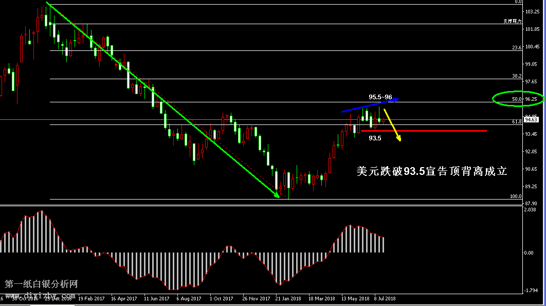 白銀短線策略:(波段:持倉觀望;短線:高拋做空為主)。 當前白銀的走勢顯然已經與美元形成的明顯的反向關聯,近期美元指數沖高回落后又出現反彈,但周線形態中出現“可能見頂”的頂背離形態,投資者應密切關注美元指數見頂信號,一旦美指反轉,則有利于白銀價格圍繞支撐位形成筑底,投資者可密切關注美元變化。如下圖所示為美元指數周線走勢圖,2018年美元雖然處于上漲形態,但從中期角度來看,近半年的上漲行情僅僅是中期下跌趨勢的一次反彈。目前美元指數觸及中期下跌趨勢50%分水嶺的95.5附近后出現了頂背離形態,即價格創出新高后,動能指標未能創出新高,暗示美元買盤力量開始減弱。配合中期阻力位的壓制,投資者需關注美元指數是否形成見頂形態,一旦美元向下跌破圖中紅線所示的前低支撐93.5,則上漲趨勢被打破,屆時配合頂背離形態成立,美指有望宣告見頂反轉,這將有利于黃金白銀企穩筑底。因此,近期投資者可重點關注美元對于93.5的跌破情況,若守穩此處,則美指仍處于反彈格局;反之,跌破此處時,美指見頂成立,屆時應重點關注金銀筑底并適當開啟做多策略。
