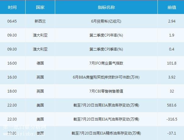 周三(7月25日)投資者需關(guān)注06:45的新西蘭6月貿(mào)易帳,09:30的澳大利亞第二季度CPI年率、季率,16:00的德國7月IFO商業(yè)景氣指數(shù),16:30的英國6月BBA房屋購買抵押貸款許可件數(shù),18:00的英國7月CBI零售銷售差值,22:30的美國EIA原油數(shù)據(jù)以及美國總統(tǒng)特朗普與歐盟進行貿(mào)易談判。