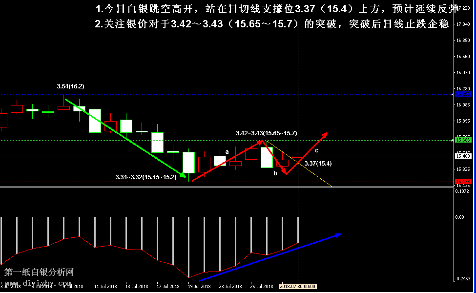 今日下方關鍵支撐3.31~3.32(15.15~15.2);今日上方關鍵阻3.43(15.7)、3.49~3.5(15.95~16)、3.54(16.2)。 提示:技術僅僅是基于概率論和統計學的一種綜合分析手段,絕非預測。所以技術分析是在考慮做好止損的情況下去博取大概率事件,投資不可過于迷信技術分析。(短線操作請一定做好止損,一旦被損,代表分析師基于概率和統計的技術分析不適用于當前行情) 另外,由于紙白銀價格是國際銀價換算而來,而換算過程中涉及到人民幣對美元匯率的變化,即使在國際銀價不變化的情況下,如果人民幣貶值或升值,也會導致紙白銀價格出現變動。因此,我們的分析只采用最新的國際銀價對應的人民幣白銀價格,如與過去分析價格有出入, 投資者應知曉其原因。 1、文中價格為紙白銀價格,括號內為國際銀價,投資者可雙向參考。 2、以上所有價格為工商銀行買入價,即紙白銀低價。進倉點位要再加點差(各銀行點差不一),出倉則不要。 3、第一紙白銀給出的所有建議僅供投資者參考,不作為下單絕對依據,切勿過于依賴。 4、北京時間09:00發布此文章。 5、上一交易日白銀價格分析情況:(7月27日)白銀二次回踩考驗支撐位 繼續關注企穩形態