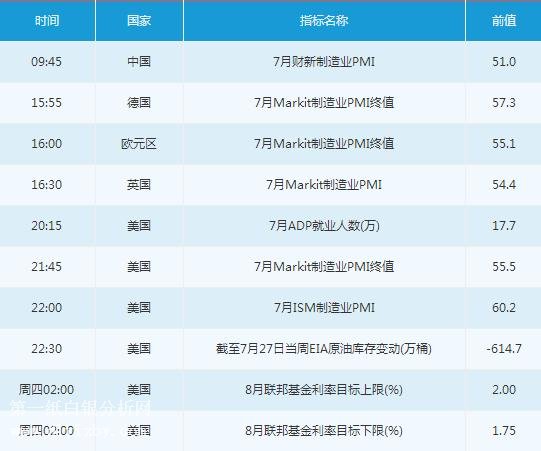 周三(8月1日)至周四凌晨,投資者應(yīng)特別重點(diǎn)關(guān)注的是周四02:00的美聯(lián)儲利率決議及其政策聲明。此外,投資者需關(guān)注的重要數(shù)據(jù)有09:45的中國7月財(cái)新制造業(yè)PMI,16:00的歐元區(qū)7月Markit制造業(yè)PMI終值,16:30的英國7月Markit制造業(yè)PMI,20:15的美國7月ADP就業(yè)人數(shù),21:45的美國7月Markit制造業(yè)PMI終值,22:00的美國7月ISM制造業(yè)PMI,22:30的美國EIA原油數(shù)據(jù)等。