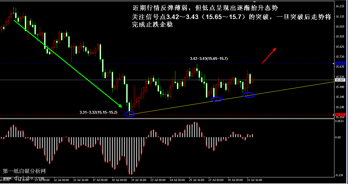 今日下方關鍵支撐3.31~3.32(15.15~15.2);今日上方關鍵阻3.43(15.7)、3.49~3.5(15.95~16)、3.55(16.2)。 提示:技術僅僅是基于概率論和統計學的一種綜合分析手段,絕非預測。所以技術分析是在考慮做好止損的情況下去博取大概率事件,投資不可過于迷信技術分析。(短線操作請一定做好止損,一旦被損,代表分析師基于概率和統計的技術分析不適用于當前行情) 另外,由于紙白銀價格是國際銀價換算而來,而換算過程中涉及到人民幣對美元匯率的變化,即使在國際銀價不變化的情況下,如果人民幣貶值或升值,也會導致紙白銀價格出現變動。因此,我們的分析只采用最新的國際銀價對應的人民幣白銀價格,如與過去分析價格有出入, 投資者應知曉其原因。 1、文中價格為紙白銀價格,括號內為國際銀價,投資者可雙向參考。 2、以上所有價格為工商銀行買入價,即紙白銀低價。進倉點位要再加點差(各銀行點差不一),出倉則不要。 3、第一紙白銀給出的所有建議僅供投資者參考,不作為下單絕對依據,切勿過于依賴。 4、北京時間09:00發布此文章。 5、上一交易日白銀價格分析情況:(7月31日)白銀仍在醞釀底部形態 密切關注信號點突破