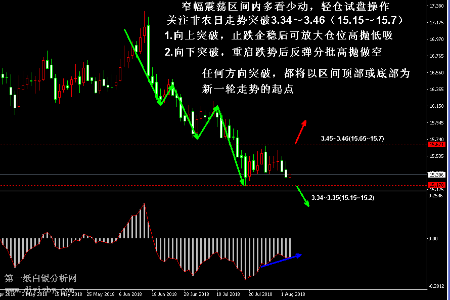 目前白銀價格是3.363克(15.32美元)。昨日銀價再次出現較大跌幅,受到美元指數大漲與黃金價格大跌的影響,白銀跟隨出現下跌,但目前依舊守穩底部支撐位3.34(15.15),短線走勢還未完成方向選擇,投資者可繼續關注窄幅波動區間3.34~3.46(15.15~15.7)的突破,在突破之前,仍保持輕倉試盤操作策略,穩健者在走勢突破區間或非農數據公布之前保持觀望。如下圖所示為白銀日線走勢圖,以大趨勢形態分析,當前銀價仍然處于圖中綠色箭頭所示的下跌趨勢之中,且該下跌趨勢并未遭遇破壞,一旦走勢無法完成止跌企穩,則行情未來延續跌勢的風險極大。近期行情圍繞中線支撐位3.34(15.15)附近形成了弱勢反彈,但觸及小阻力3.46(15.7)后停止上漲,最終走勢持續運行于3.34~3.46(15.15~15.7)的窄幅區間內震蕩。在今日非農數據作用下,日內投資者可密切關注圖中紅線所示區間3.34~3.46(15.15~15.7)的突破情況:1.若銀價向上突破3.46(15.7)的區間高點,則將確認行情圍繞3.34(15.15)止跌企穩的事實,后市走勢將逐漸轉強并擴大震蕩區間至3.34~3.57(15.15~16.2);2.若銀價向下突破3.34(15.15)的區間低點,則走勢將延續圖中綠色箭頭所示的主趨勢下跌,跌破支撐后將向下打開空間,行情將重新開啟新一輪跌勢。值得注意的是,無論近期行情如何突破,當前窄幅波動區間的高點和低點3.46(15.7)與3.34(15.15)都將成為突破后的起點,即向上突破后,3.34(15.15)可定義為起始上漲點和止損點,投資者圍繞該點位不破回落低吸做多;向下突破后,3.46(15.7)可定義為起始下跌點和止損點,投資者可圍繞該點位不被突破反彈分批做空。另外,隨著昨日銀價下跌,但動能指標如圖中藍色箭頭所示,仍然顯示出放量不足的現象,目前不可急于斷定走勢多空選擇,密切關注今日非農數據刺激下,白銀對于區間3.34~3.46(15.15~15.7)的突破,突破后日內超短線宜跟隨突破方向順勢操作。綜合分析,美元近期大漲,而黃金價格破位下跌,這并不利于白銀走勢,不過銀價仍然運行于震蕩區間時,投資者暫不可盲目猜測多空方向,密切關注今日晚間20:30公布的非農數據,針對此次技術面與非農數據消息面,第一紙白銀繼續總結4種非農做單策略,僅供投資者參考: