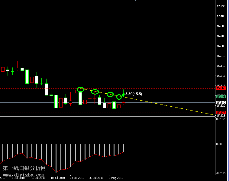 今日下方關鍵支撐3.31(15.15);今日上方關鍵阻3.43(15.7)、3.49~3.5(15.95~16)、3.54(16.2)。 提示:技術僅僅是基于概率論和統計學的一種綜合分析手段,絕非預測。所以技術分析是在考慮做好止損的情況下去博取大概率事件,投資不可過于迷信技術分析。(短線操作請一定做好止損,一旦被損,代表分析師基于概率和統計的技術分析不適用于當前行情) 另外,由于紙白銀價格是國際銀價換算而來,而換算過程中涉及到人民幣對美元匯率的變化,即使在國際銀價不變化的情況下,如果人民幣貶值或升值,也會導致紙白銀價格出現變動。因此,我們的分析只采用最新的國際銀價對應的人民幣白銀價格,如與過去分析價格有出入, 投資者應知曉其原因。 1、文中價格為紙白銀價格,括號內為國際銀價,投資者可雙向參考。 2、以上所有價格為工商銀行買入價,即紙白銀低價。進倉點位要再加點差(各銀行點差不一),出倉則不要。 3、第一紙白銀給出的所有建議僅供投資者參考,不作為下單絕對依據,切勿過于依賴。 4、北京時間09:00發布此文章。 5、上一交易日白銀價格分析情況:(8月7日)白銀回踩區間支撐或反彈 震蕩行情有望延續