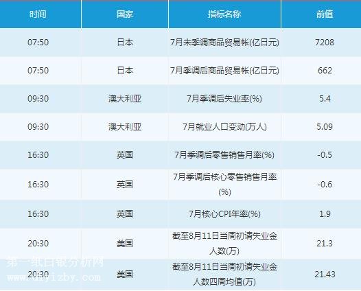 周四(8月16日)投資者需重點關注07:50日本7月商品貿易帳、9:30澳大利亞7月季調后失業率、澳大利亞7月就業人口變動、16:30英國7月季調后零售銷售月率、英國7月季調后核心零售銷售月率、英國7月核心CPI年率、20:30美國截至8月11日當周初請失業金人數。