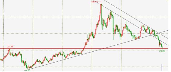 就技術(shù)面而言,白銀的弱勢(shì)特征顯現(xiàn)無疑,就技術(shù)分析的角度來看,目前白銀的運(yùn)行區(qū)間已經(jīng)開始切入白銀在2008年3月到2010年9月形成的大突破前夕的大震蕩區(qū)域,這個(gè)區(qū)域的價(jià)格的密集支撐區(qū)間價(jià)格帶在18.5——19.5,就目前的白銀市場(chǎng)發(fā)展走勢(shì)看,無論是從大周期的支撐壓力帶轉(zhuǎn)換的角度看,還是從白銀今年的下跌節(jié)奏和變化幅度看,還是從白銀自2011年4月高點(diǎn)以來的整體下跌結(jié)構(gòu)看,白銀的下步發(fā)展動(dòng)向很可能將走向19一帶,也就是說白銀將有很大機(jī)會(huì)重新見到十字頭的價(jià)格,就短線而言,白銀在20上下的整數(shù)關(guān)口恐將有心理性的支撐,但是這種支撐力度有限,另外可以關(guān)注21上下的技術(shù)支撐,如果這兩個(gè)位置都難以支撐白銀的話,后面跌破20恐將是大概率事件了。