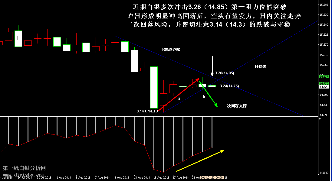 今日下方關鍵支撐3.17(14.45)、3.14(14.3)、2.98(13.6);今日上方關鍵阻3.24~3.26(14.75~14.85)、3.3(15)、3.32~3.33(15.1~15.15)、3.37(15.35)、3.41~3.42(15.5~15.55)、3.45(15.7)。 提示:技術僅僅是基于概率論和統計學的一種綜合分析手段,絕非預測。所以技術分析是在考慮做好止損的情況下去博取大概率事件,投資不可過于迷信技術分析。(短線操作請一定做好止損,一旦被損,代表分析師基于概率和統計的技術分析不適用于當前行情) 另外,由于紙白銀價格是國際銀價換算而來,而換算過程中涉及到人民幣對美元匯率的變化,即使在國際銀價不變化的情況下,如果人民幣貶值或升值,也會導致紙白銀價格出現變動。因此,我們的分析只采用最新的國際銀價對應的人民幣白銀價格,如與過去分析價格有出入, 投資者應知曉其原因。 1、文中價格為紙白銀價格,括號內為國際銀價,投資者可雙向參考。 2、以上所有價格為工商銀行買入價,即紙白銀低價。進倉點位要再加點差(各銀行點差不一),出倉則不要。 3、第一紙白銀給出的所有建議僅供投資者參考,不作為下單絕對依據,切勿過于依賴。 4、北京時間09:00發布此文章。 5、上一交易日白銀價格分析情況:(8月22日)白銀繼續考驗阻力帶 謹防走勢二次回踩風險