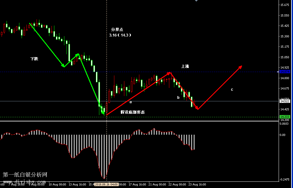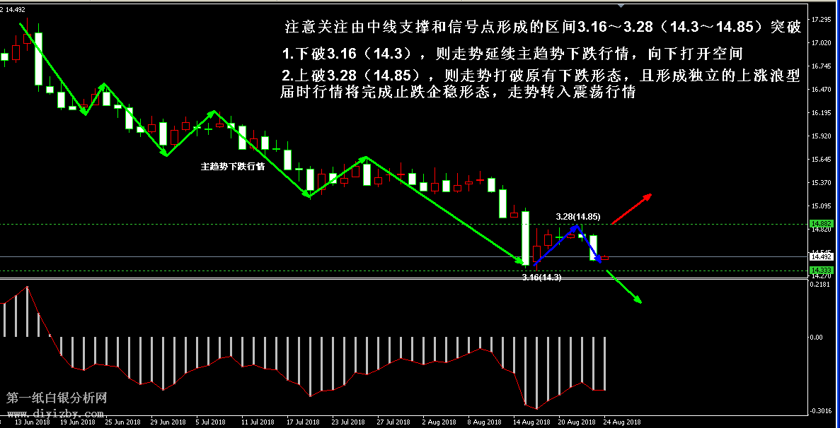 今日下方關鍵支撐3.19(14.45)、3.16(14.3)、3.0(13.6);今日上方關鍵阻3.26~3.28(14.75~14.85)、3.39(15.35)、3.42(15.5)、3.46(15.7)。 提示:技術僅僅是基于概率論和統計學的一種綜合分析手段,絕非預測。所以技術分析是在考慮做好止損的情況下去博取大概率事件,投資不可過于迷信技術分析。(短線操作請一定做好止損,一旦被損,代表分析師基于概率和統計的技術分析不適用于當前行情) 另外,由于紙白銀價格是國際銀價換算而來,而換算過程中涉及到人民幣對美元匯率的變化,即使在國際銀價不變化的情況下,如果人民幣貶值或升值,也會導致紙白銀價格出現變動。因此,我們的分析只采用最新的國際銀價對應的人民幣白銀價格,如與過去分析價格有出入, 投資者應知曉其原因。 1、文中價格為紙白銀價格,括號內為國際銀價,投資者可雙向參考。 2、以上所有價格為工商銀行買入價,即紙白銀低價。進倉點位要再加點差(各銀行點差不一),出倉則不要。 3、第一紙白銀給出的所有建議僅供投資者參考,不作為下單絕對依據,切勿過于依賴。 4、北京時間09:00發布此文章。 5、上一交易日白銀價格分析情況:(8月23日)白銀阻力沖高回落 走勢或再次下跌考驗支撐