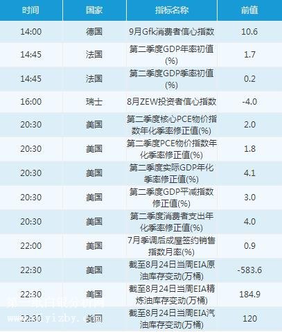 周三(8月29日)投資者需重點(diǎn)關(guān)注14:00德國(guó)9月Gfk消費(fèi)者信心指數(shù)、14:45法國(guó)第二季度GDP年率(季率)初值、16:00瑞士8月ZEW投資者信心指數(shù)、20:30美國(guó)第二季度(核心)PCE物價(jià)指數(shù)年化季率修正值、美國(guó)第二季度實(shí)際GDP年化季率修正值、美國(guó)第二季度消費(fèi)者支出年化季率修正值、22:00美國(guó)7月季調(diào)后成屋簽約銷售指數(shù)月率、22:30美國(guó)截至8月24日當(dāng)周EIA原油庫(kù)存變動(dòng)。