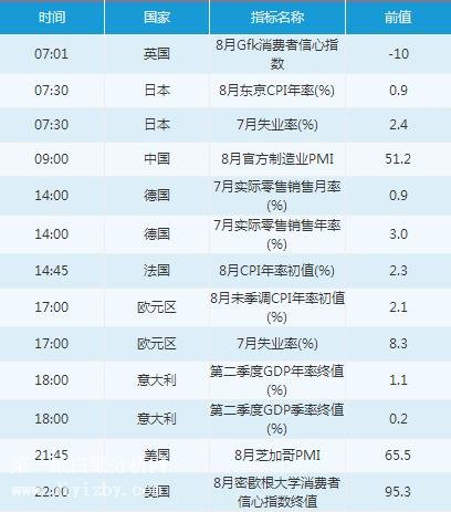 周五(8月31日)投資者需重點關注7:01英國8月Gfk消費者信心指數、7:30日本8月東京CPI年率、日本7月失業率、9:00中國8月官方制造業PMI、14:00德國7月實際零售銷售月率(年率)、14:45法國8月CPI年率初值、17:00歐元區8月未季調CPI年率初值、歐元區7月失業率、18:00意大利第二季度GDP終值、21:45美國8月芝加哥PMI、22:00美國8月密歇根大學消費者信心指數終值。