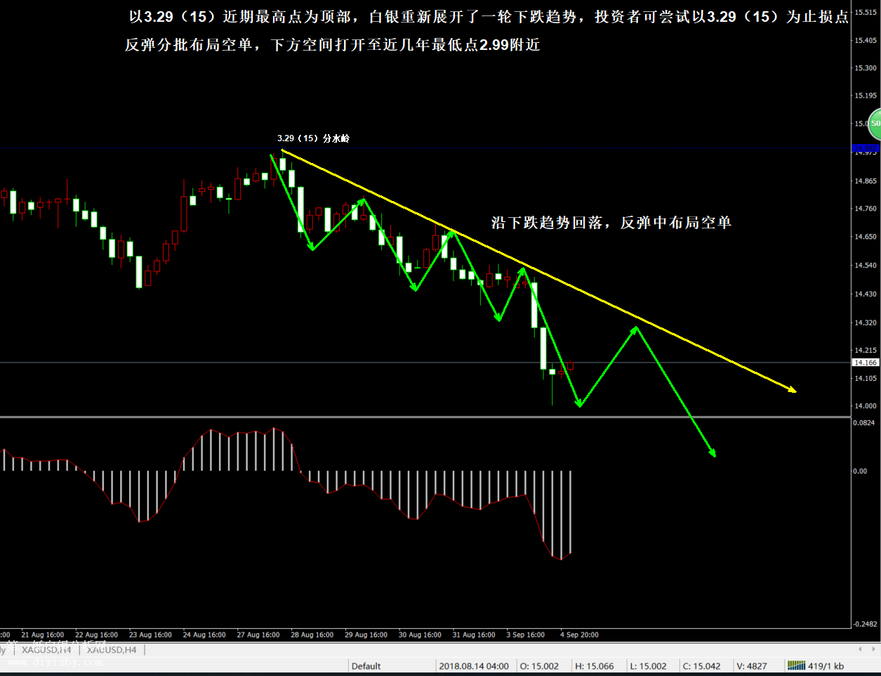 目前白銀價格是3.112元/克(14.1675美元/盎司)。昨日銀價大幅下跌,一舉跌破了3.14(14.3)的中線支撐和底部,由此向下完成方向選擇并打開空間,短期內(nèi)走勢再度轉(zhuǎn)入下跌格局。隨著行情向下破位3.14(14.3)以后,走勢打破了中線支撐可能出現(xiàn)的雙底形態(tài),下一道強支撐則位于近幾年的最低點2.99(13.6)附近,銀價較大概率在后市將向著該點位沖擊,短線做空者可以此處為最終獲利目標。如下圖所示為白銀4小時周期走勢圖,在銀價破位3.14(14.3)的底部位置以后,走勢不僅僅向下打開回落空間,同時也形成了新一輪的下跌趨勢。圖中綠色箭頭顯示銀價正維持震蕩下跌格局,行情保持良好的“高點低點不斷下移”的特征,其中3.29(15)是此輪下跌的起始點,該點位可定義為當前銀價反轉(zhuǎn)的分水嶺點位,只要走勢不能再次突破此處,則白銀仍將處于下跌趨勢的形態(tài)內(nèi)波動。除此之外,圖中黃色趨勢線還顯示銀價正處于快速下跌格局中運行,該下跌趨勢線角度較大,暗示走勢的反彈空間有限,再度觸及趨勢線阻力后是投資者布局空單的良好機會。日內(nèi)激進者可直接采取反彈中分批2~3分(0.1~0.15)的方式布局空單,穩(wěn)健者則重點在趨勢線壓力3.16~3.17(14.4~14.45)附近進場做空,若繼續(xù)反彈則可分批在3.24(14.75)、3.27(14.9)兩線加倉空單,統(tǒng)一止損分水嶺3.29(15)上方,目標看至3.07(14)、2.99(13.6)擇機離場。值得注意的是,昨日行情破位中線支撐以后,走勢已經(jīng)強行修復(fù)了底背離形態(tài),短期內(nèi)銀價不在具備重新止跌企穩(wěn)的條件,行情繼續(xù)保持下行趨勢的概率極大。此時正如圖中綠色箭頭配合黃色趨勢線所示,投資者應(yīng)積極在反彈中布局空單,白銀下方仍有較大空間,在走勢重新觸及強支撐和顯現(xiàn)出止跌可能性之前,暫時放棄抄底做多。綜合分析:此前我們曾假設(shè)3.14(14.3)企穩(wěn)后形成雙底的中線反彈,但銀價未能守住該支撐,由此打破了中長線形成“雙底”的可能性。在破位以后,距離當前價格最近一道的強支撐位于2015年低點2.99(13.6)附近,銀價較大概率將再次沖擊該點位并存在破位風(fēng)險。目前投資者可暫時不考慮行情何時止跌,僅以順勢反彈做空策略為主,隨著走勢沿趨勢線下行,短線空單將有不斷擴大盈利空間的希望。