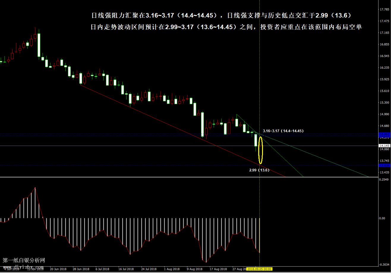 今日下方關(guān)鍵支撐3.07(14)、2.99(13.6);今日上方關(guān)鍵阻力3.16~3.17(14.4~14.45)、3.24(14.75)、3.27(14.9)、3.29(15)。 提示:技術(shù)僅僅是基于概率論和統(tǒng)計學(xué)的一種綜合分析手段,絕非預(yù)測。所以技術(shù)分析是在考慮做好止損的情況下去博取大概率事件,投資不可過于迷信技術(shù)分析。(短線操作請一定做好止損,一旦被損,代表分析師基于概率和統(tǒng)計的技術(shù)分析不適用于當前行情) 另外,由于紙白銀價格是國際銀價換算而來,而換算過程中涉及到人民幣對美元匯率的變化,即使在國際銀價不變化的情況下,如果人民幣貶值或升值,也會導(dǎo)致紙白銀價格出現(xiàn)變動。因此,我們的分析只采用最新的國際銀價對應(yīng)的人民幣白銀價格,如與過去分析價格有出入, 投資者應(yīng)知曉其原因。 1、文中價格為紙白銀價格,括號內(nèi)為國際銀價,投資者可雙向參考。 2、以上所有價格為工商銀行買入價,即紙白銀低價。進倉點位要再加點差(各銀行點差不一),出倉則不要。 3、第一紙白銀給出的所有建議僅供投資者參考,不作為下單絕對依據(jù),切勿過于依賴。 4、北京時間09:00發(fā)布此文章。 5、上一交易日白銀價格分析情況:(9月4日)白銀支撐停止下跌 底背離后關(guān)注多空變盤風(fēng)險