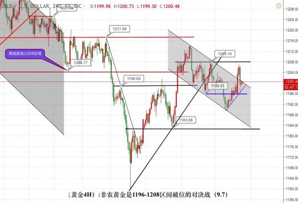 昨日市場如期下探周三盤中強(qiáng)弱分界線的1196后歐美盤走高,盤中1196多到位1202下降通道的阻力點(diǎn),美盤前1203再多單美盤依然持續(xù)承壓在前期盤中阻力1208下方,所以1205.5果斷離場,完美躲過了盤尾再次回撤到1196的風(fēng)險,原本看似強(qiáng)勢的日線最終還是未能給市場指出明確的方向,多空爭奪戰(zhàn)只能在今日非農(nóng)一決勝負(fù),而1196的多頭防守和1208的關(guān)鍵阻力形成的區(qū)間將是市場多空爭奪戰(zhàn)的勝負(fù)裁判,企穩(wěn)1208多天仍具備重新起航的動能和空間,但若再破1196,短線多頭則無力回天!
