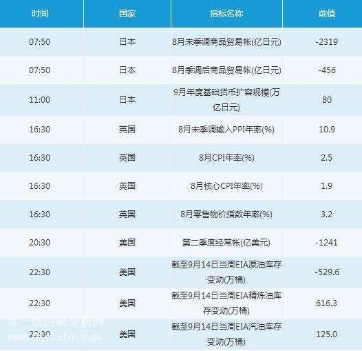 周三(9月19日)投資者需重點(diǎn)關(guān)注7:50日本8月商品貿(mào)易帳、11:00日本央行利率決議、14:30日本央行行長黑田東彥召開新聞發(fā)布會、16:30英國8月PPI與CPI、英國8月零售物價指數(shù)、20:30美國第二季度經(jīng)常帳、21:00 歐洲央行行長德拉基(Mario Draghi)在歐洲經(jīng)濟(jì)論壇發(fā)表講話、22:30美國截至9月14日當(dāng)周EIA原油庫存變動。