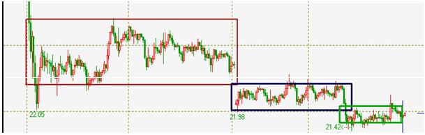 從三個連續的箱體結構看,有兩點值得關注,一是箱體的震蕩空間在逐漸的收縮,從最初的寬箱體震蕩逐漸呈現收縮的跡象,二是箱體延續的時間在逐漸的縮短,這兩個特點究竟是在說明多方的抵抗力越來越弱還是說明多空雙方的爭斗越來越直接而間斷,這其中是否蘊含著一些重要的交易信號,非常值得關注。