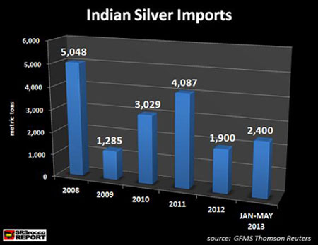 如果目前每月大規模進口白銀的趨勢繼續下去,那么印度可能會在2013年創下歷史紀錄。據業內人士透露,2013年的前5個月,印度已經進口了2400噸白銀,這比2012年全年進口量1900噸還要高。 如果我們細看下圖,便會發現,印度在2008年的白銀進口量創下了歷史紀錄,達到了5048噸。那一年,白銀價格觸及了歷史高位至每盎司21美元,最低價也曾跌至每盎司9美元。那年3月,由于銀價漲至最高位,印度的白銀進口量也達到了歷史最高額,在銀價一路下跌,直至2008年10月銀價跌至每盎司9美元的過程中,印度甚至進口了更多的白銀。
