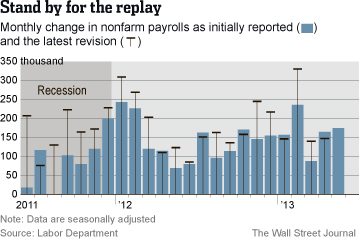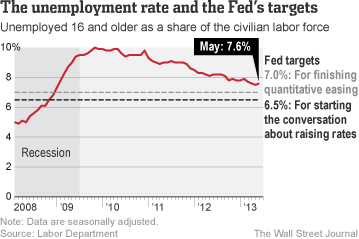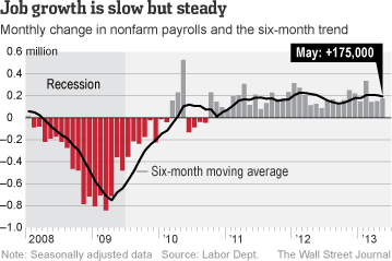 2.數字修訂:過去許多月就業報告中的重要數據,雖然不是從新估算,但也被多次修正。舉個例子,3月非農就業數據初步估計是令人擔憂的8.8萬人,但經過修訂后達到14.2萬人。但是修訂數據也不是重要的,因為這只是提供一個前幾個月更正準確的宏觀圖片。雖然這些數據也為未來幾個月的預測提供關鍵線索,但在加快聘用期間,勞工部的初步估計數字往往是低估就業增長,這意味著可以使得未來幾個月顯現出好的增長。所以要小心向下修訂的數字。 3.美聯儲所關心的問題:上個月伯南克在國會的證詞掀起了債券拋售的熱潮,這促使央行官員紛紛發表言論解釋美聯儲的意思,安撫市場。在紛亂過后,我們要注意的是美聯儲的就業預期是建立在相對樂觀的經濟增長預期基礎上的。按照亞特蘭大聯儲的簡單計算,如果每個月增加16.7萬個就業崗位,則在明年6月實現失業人數下降至7%的目標。因此,任何過快或過慢的增長都會引起美聯儲和市場的關注。