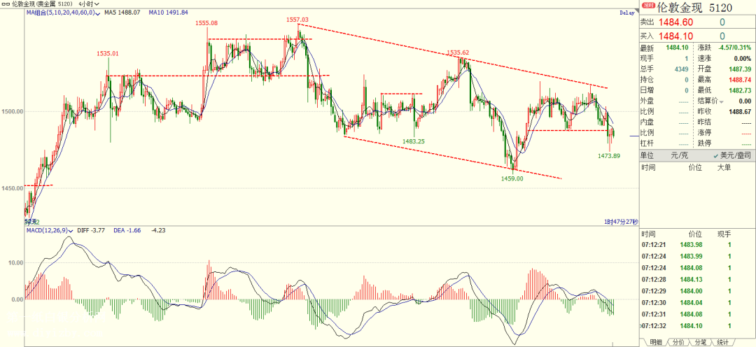 4小時如圖,上周金價處于下降通道運行,目前下降通道運行良好,處于下行格局。此外,上周五金價跌破1488-1490美元/盎司,形成短期“M”形態,有繼續下行條件。