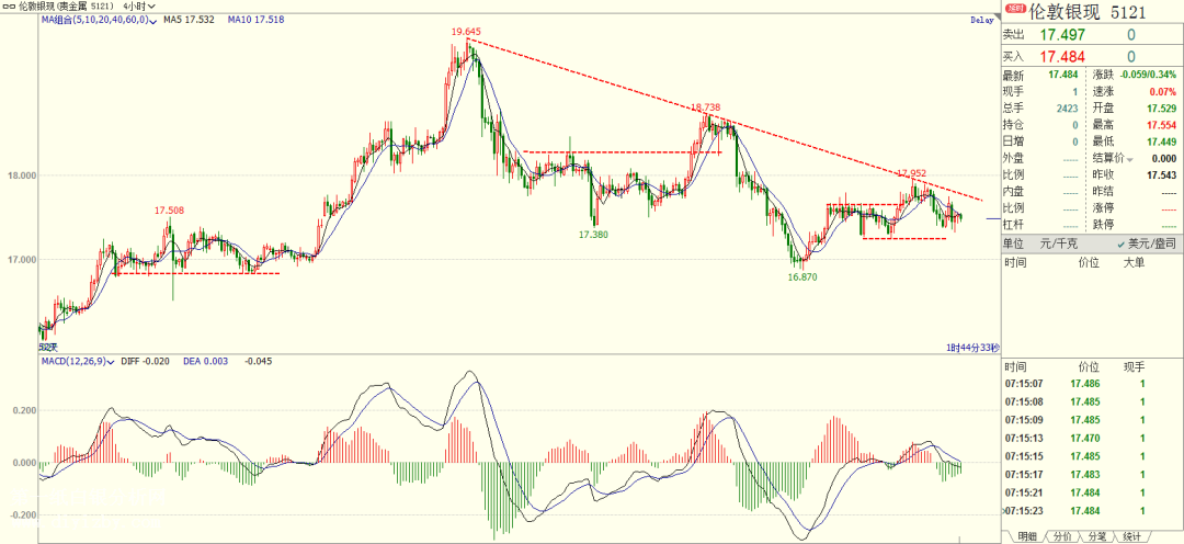 4小時如圖,受下降趨勢線壓制,白銀處于弱勢狀態,但下行17.2美元/盎司附近具備較強支撐,未向下跌破,目前屬于17.2美元/盎司的支撐與下降趨勢線所形成的收斂震蕩。