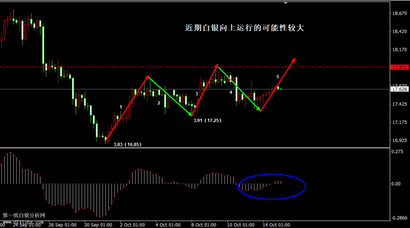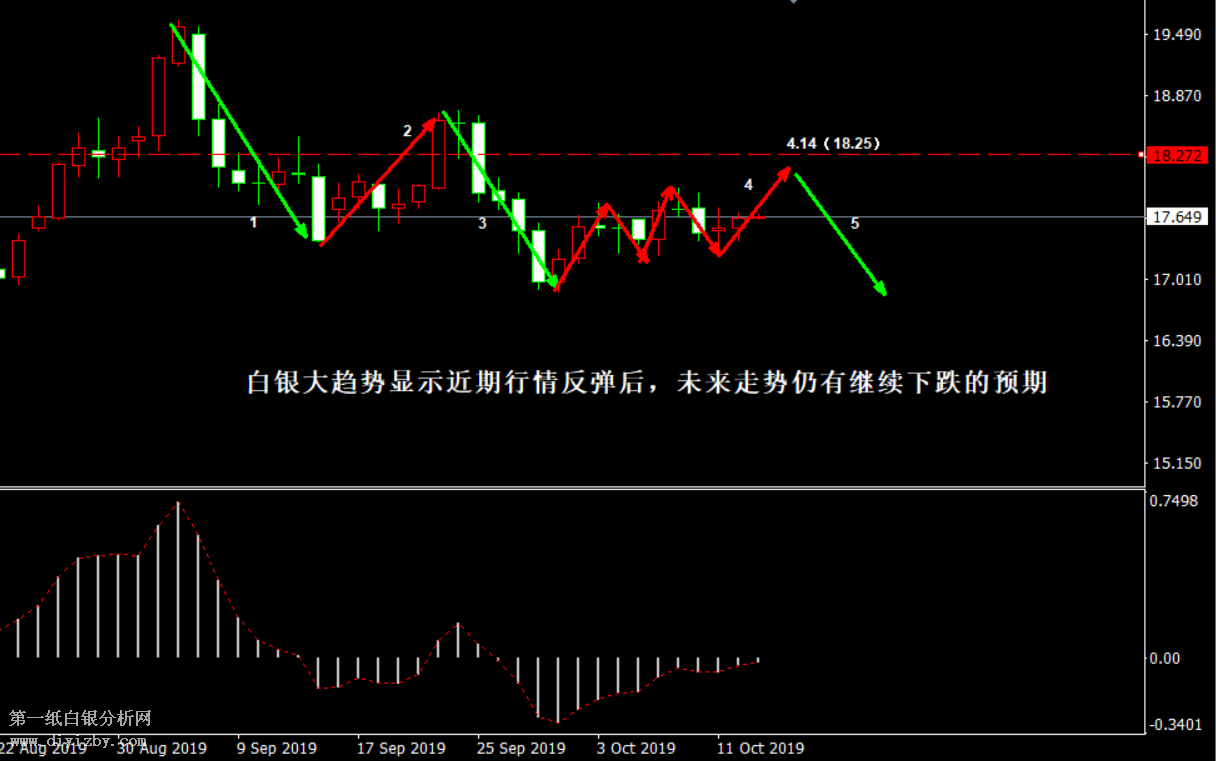 今日下方關鍵支撐3.91(17.25)、3.88(17.1)、3.77~3.78(16.6~16.65)、3.73~3.74(16.45~16.5)。;今日上方關鍵阻力4.03(17.75)、4.09(18)、4.13(18.2)、4.25(18.7)。 提示:技術僅僅是基于概率論和統計學的一種綜合分析手段,絕非預測。所以技術分析是在考慮做好止損的情況下去博取大概率事件,投資不可過于迷信技術分析。(短線操作請一定做好止損,一旦被損,代表分析師基于概率和統計的技術分析不適用于當前行情) 另外,由于紙白銀價格是國際銀價換算而來,而換算過程中涉及到人民幣對美元匯率的變化,即使在國際銀價不變化的情況下,如果人民幣貶值或升值,也會導致紙白銀價格出現變動。因此,我們的分析只采用最新的國際銀價對應的人民幣白銀價格,如與過去分析價格有出入, 投資者應知曉其原因。 1、文中價格為紙白銀價格,括號內為國際銀價,投資者可雙向參考。 2、以上價格為工商銀行買入價,即紙白銀低價。進倉點位要再加點差(各銀行點差不一),出倉則不要。 3、第一紙白銀給出的所有建議僅供投資者參考,不作為下單依據,作者不持有白銀,也不計劃買入。觀點僅供參考,不構成投資建議,風險自擔。 4、北京時間09:00發布此文章。 5、上一交易日白銀價格分析情況:(10月14日)白銀短線面臨方向選擇 謹防行情向上反彈風險