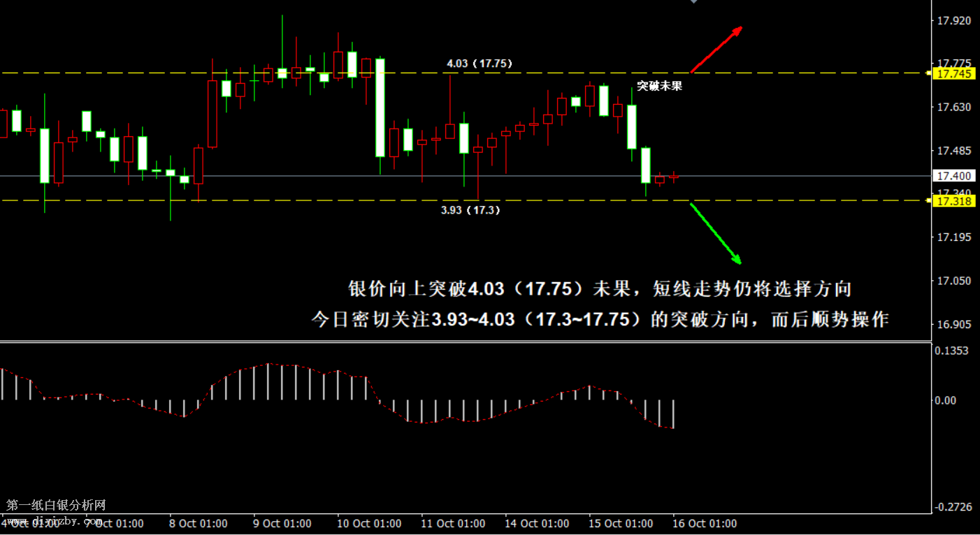 今日下方關鍵支撐3.93(17.3)、3.77~3.78(16.6~16.65)、3.73~3.74(16.45~16.5)。;今日上方關鍵阻力4.03(17.75)、4.09(18)、4.13(18.2)、4.25(18.7)。 提示:技術僅僅是基于概率論和統計學的一種綜合分析手段,絕非預測。所以技術分析是在考慮做好止損的情況下去博取大概率事件,投資不可過于迷信技術分析。(短線操作請一定做好止損,一旦被損,代表分析師基于概率和統計的技術分析不適用于當前行情) 另外,由于紙白銀價格是國際銀價換算而來,而換算過程中涉及到人民幣對美元匯率的變化,即使在國際銀價不變化的情況下,如果人民幣貶值或升值,也會導致紙白銀價格出現變動。因此,我們的分析只采用最新的國際銀價對應的人民幣白銀價格,如與過去分析價格有出入, 投資者應知曉其原因。 1、文中價格為紙白銀價格,括號內為國際銀價,投資者可雙向參考。 2、以上價格為工商銀行買入價,即紙白銀低價。進倉點位要再加點差(各銀行點差不一),出倉則不要。 3、第一紙白銀給出的所有建議僅供投資者參考,不作為下單依據,作者不持有白銀,也不計劃買入。觀點僅供參考,不構成投資建議,風險自擔。 4、北京時間09:00發布此文章。 5、上一交易日白銀價格分析情況:(10月15日)白銀大趨勢看跌仍不變 但短線走勢或迎來反彈