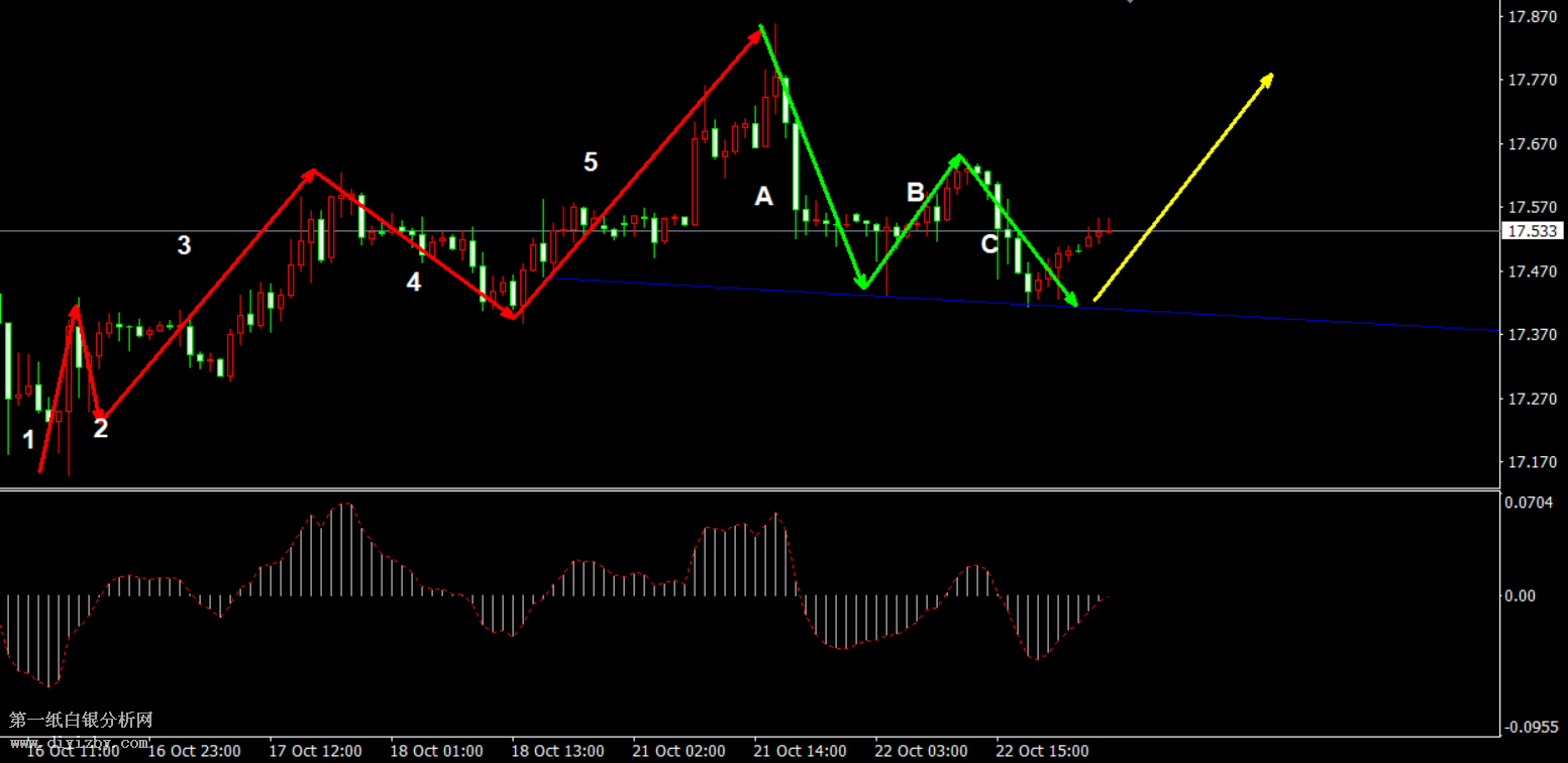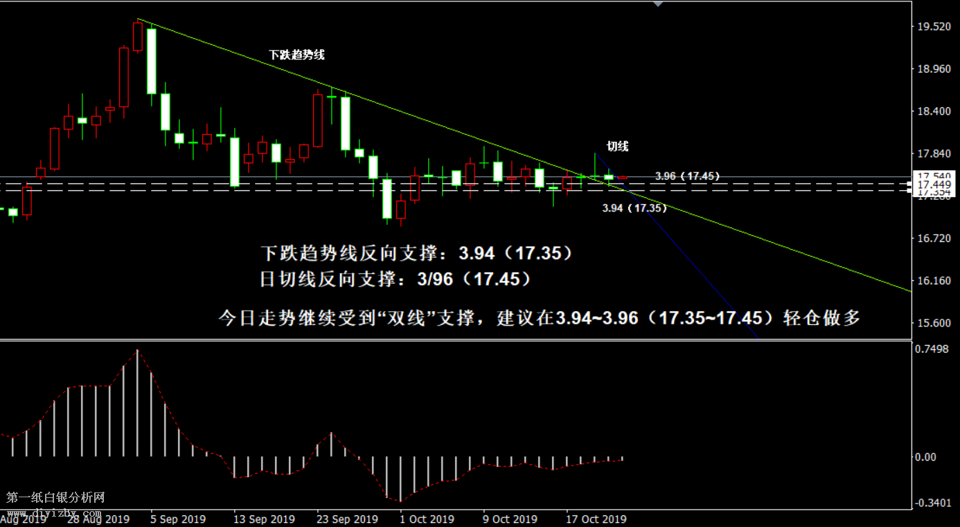 今日下方關鍵支撐3.9(17.1)、3.83(16.85)、3.77~3.78(16.6~16.65)、3.73~3.74(16.45~16.5)。;今日上方關鍵阻力4.1(18)、4.14(18.2)、4.25(18.7)。 提示:技術僅僅是基于概率論和統計學的一種綜合分析手段,絕非預測。所以技術分析是在考慮做好止損的情況下去博取大概率事件,投資不可過于迷信技術分析。(短線操作請一定做好止損,一旦被損,代表分析師基于概率和統計的技術分析不適用于當前行情) 另外,由于紙白銀價格是國際銀價換算而來,而換算過程中涉及到人民幣對美元匯率的變化,即使在國際銀價不變化的情況下,如果人民幣貶值或升值,也會導致紙白銀價格出現變動。因此,我們的分析只采用最新的國際銀價對應的人民幣白銀價格,如與過去分析價格有出入, 投資者應知曉其原因。 1、文中價格為紙白銀價格,括號內為國際銀價,投資者可雙向參考。 2、以上價格為工商銀行買入價,即紙白銀低價。進倉點位要再加點差(各銀行點差不一),出倉則不要。 3、第一紙白銀給出的所有建議僅供投資者參考,不作為下單依據,作者不持有白銀,也不計劃買入。觀點僅供參考,不構成投資建議,風險自擔。 4、北京時間09:00發布此文章。 5、上一交易日白銀價格分析情況:(10月22日)白銀先漲后跌上演過山車 日內支撐仍關注反彈