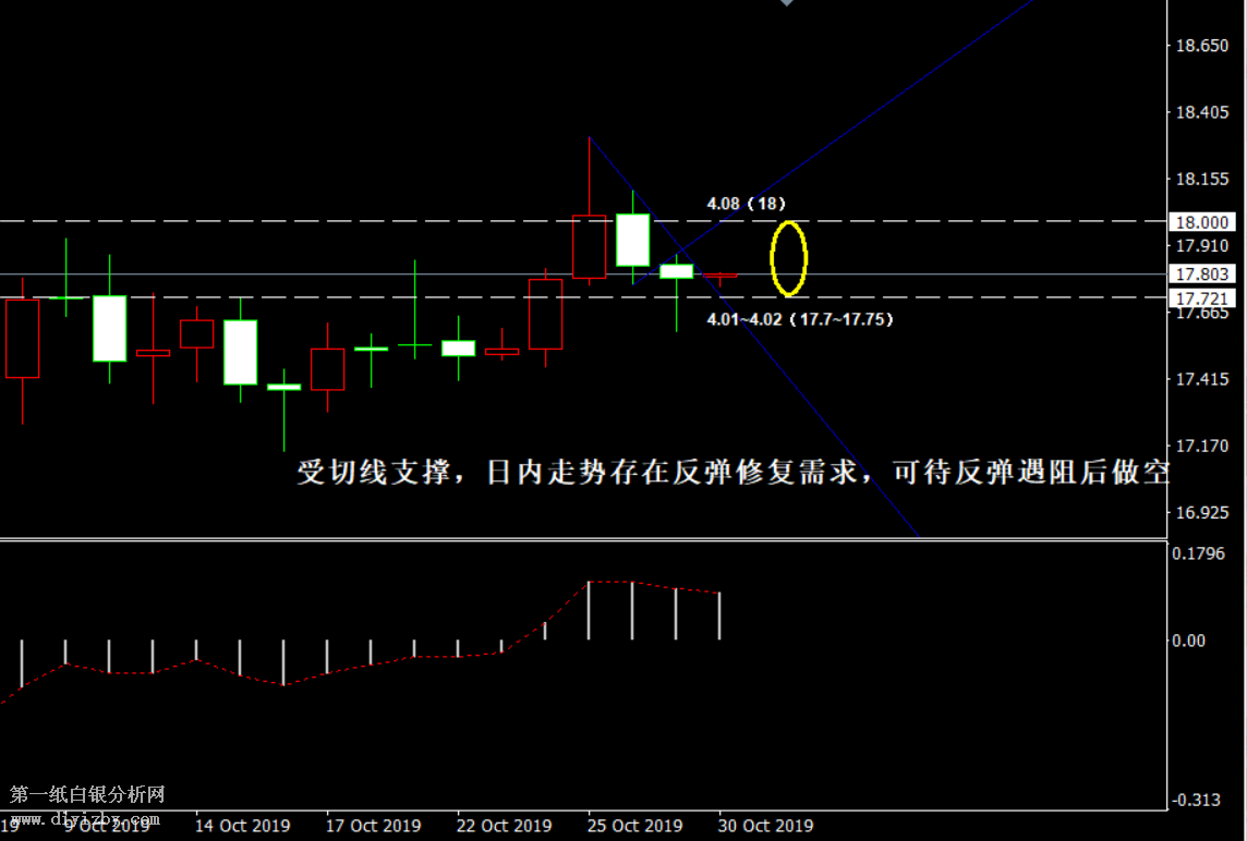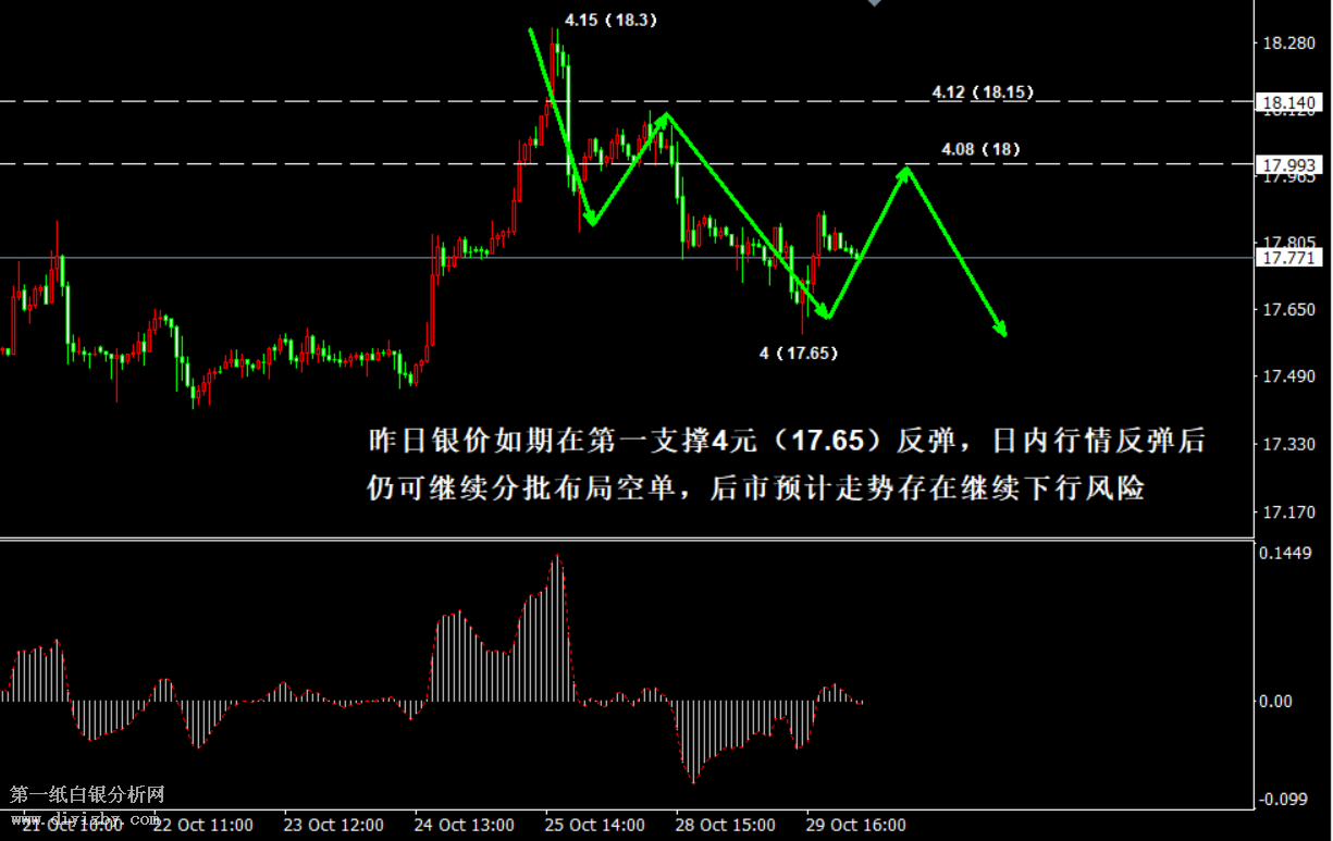 今日下方關鍵支撐4(17.65)、3.9(17.2)、3.81(16.85)、3.75~3.77(16.6~16.65)、3.71~3.72(16.45~16.5);今日上方關鍵阻力4.08(18)、4.12(18.15)、4.14(18.3)。 提示:技術僅僅是基于概率論和統計學的一種綜合分析手段,絕非預測。所以技術分析是在考慮做好止損的情況下去博取大概率事件,投資不可過于迷信技術分析。(短線操作請一定做好止損,一旦被損,代表分析師基于概率和統計的技術分析不適用于當前行情) 另外,由于紙白銀價格是國際銀價換算而來,而換算過程中涉及到人民幣對美元匯率的變化,即使在國際銀價不變化的情況下,如果人民幣貶值或升值,也會導致紙白銀價格出現變動。因此,我們的分析只采用最新的國際銀價對應的人民幣白銀價格,如與過去分析價格有出入, 投資者應知曉其原因。 1、文中價格為紙白銀價格,括號內為國際銀價,投資者可雙向參考。 2、以上價格為工商銀行買入價,即紙白銀低價。進倉點位要再加點差(各銀行點差不一),出倉則不要。 3、第一紙白銀給出的所有建議僅供投資者參考,不作為下單依據,作者不持有白銀,也不計劃買入。觀點僅供參考,不構成投資建議,風險自擔。 4、北京時間09:00發布此文章。 5、上一交易日白銀價格分析情況:(10月29日)白銀回落確認開啟跌勢 近期繼續逢高布局空單