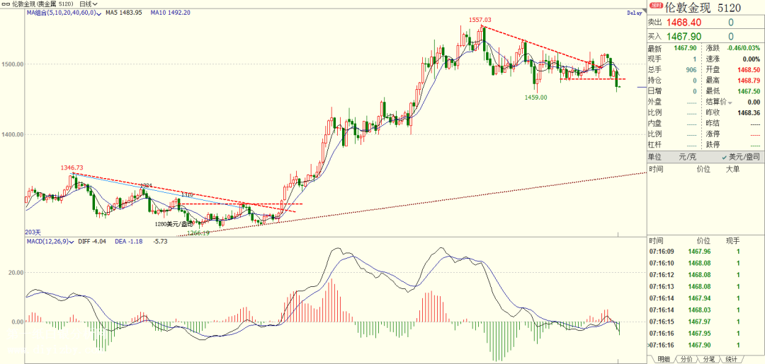 所以,日內(nèi)操作可繼續(xù)逢高做空,預(yù)計(jì)金價(jià)將慣性下跌,繼續(xù)關(guān)注1460美元/盎司一線的支撐,上方阻力參考1475-1578美元/盎司。