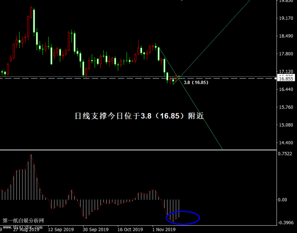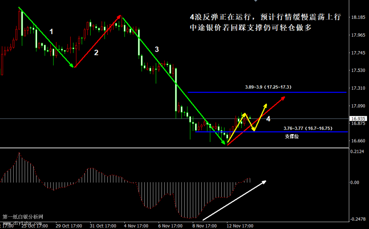 今日下方關鍵支撐3.8(16.85)、3.76~3.77(16.7~16.75)、3.71(16.5)。;今日上方關鍵阻力3.89~3.9(17.25~17.3)。 提示:技術僅僅是基于概率論和統計學的一種綜合分析手段,絕非預測。所以技術分析是在考慮做好止損的情況下去博取大概率事件,投資不可過于迷信技術分析。(短線操作請一定做好止損,一旦被損,代表分析師基于概率和統計的技術分析不適用于當前行情) 另外,由于紙白銀價格是國際銀價換算而來,而換算過程中涉及到人民幣對美元匯率的變化,即使在國際銀價不變化的情況下,如果人民幣貶值或升值,也會導致紙白銀價格出現變動。因此,我們的分析只采用最新的國際銀價對應的人民幣白銀價格,如與過去分析價格有出入, 投資者應知曉其原因。 1、文中價格為紙白銀價格,括號內為國際銀價,投資者可雙向參考。 2、以上價格為工商銀行買入價,即紙白銀低價。進倉點位要再加點差(各銀行點差不一),出倉則不要。 3、第一紙白銀給出的所有建議僅供投資者參考,不作為下單依據,作者不持有白銀,也不計劃買入。觀點僅供參考,不構成投資建議,風險自擔。 4、北京時間09:00發布此文章。 5、上一交易日白銀價格分析情況:(11月13日)白銀空頭力量逐漸減弱 短線走勢仍存反彈預期