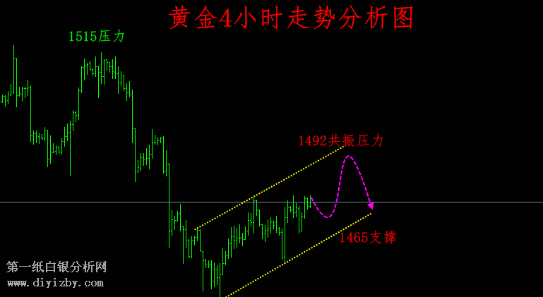 如上圖所示:4H的反彈通道還在持續,跌破旗形整理的通道,黃金會繼續向下運行。不破這個通道,那么黃金就是慢牛的震蕩修正走勢。下方的支撐位置1465-1467的通道支撐,上方的通道壓力位置1488-1492這里。