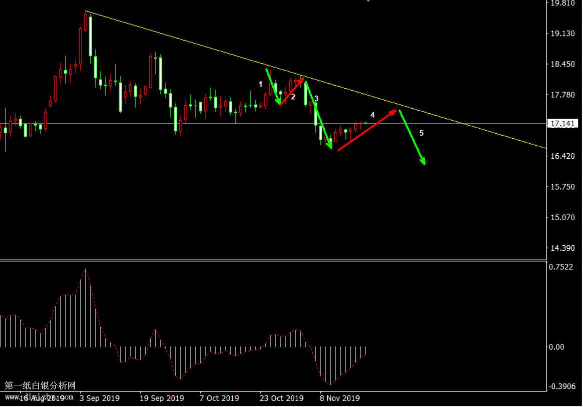 今日下方關鍵支撐3.83(16.95)、3.8(16.85)、3.73(16.5)。今日上方關鍵阻力3.89~3.9(17.2~17.3)。 提示:技術僅僅是基于概率論和統計學的一種綜合分析手段,絕非預測。所以技術分析是在考慮做好止損的情況下去博取大概率事件,投資不可過于迷信技術分析。(短線操作請一定做好止損,一旦被損,代表分析師基于概率和統計的技術分析不適用于當前行情) 另外,由于紙白銀價格是國際銀價換算而來,而換算過程中涉及到人民幣對美元匯率的變化,即使在國際銀價不變化的情況下,如果人民幣貶值或升值,也會導致紙白銀價格出現變動。因此,我們的分析只采用最新的國際銀價對應的人民幣白銀價格,如與過去分析價格有出入, 投資者應知曉其原因。 1、文中價格為紙白銀價格,括號內為國際銀價,投資者可雙向參考。 2、以上價格為工商銀行買入價,即紙白銀低價。進倉點位要再加點差(各銀行點差不一),出倉則不要。 3、第一紙白銀給出的所有建議僅供投資者參考,不作為下單依據,作者不持有白銀,也不計劃買入。觀點僅供參考,不構成投資建議,風險自擔。 4、北京時間09:00發布此文章。 5、上一交易日白銀價格分析情況:(11月20日)白銀反彈行情暫未結束 但運行過程或仍然緩慢
