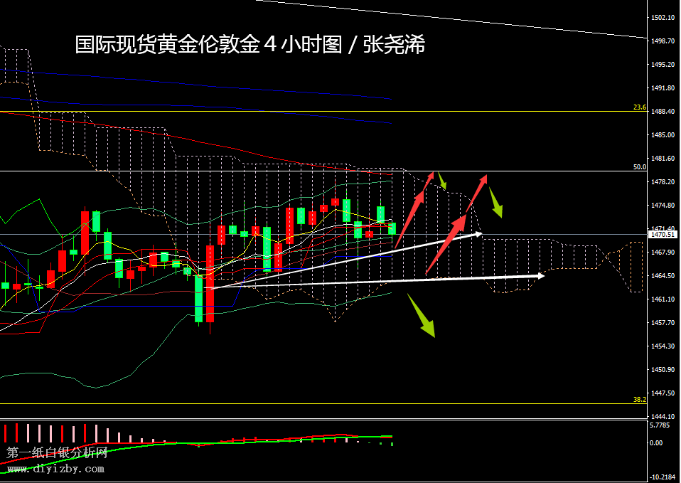 4小時級別,金價依托30周期線為支撐震蕩反彈上行,并運行在云帶之中,后市仍有向上發展突破云層到至1480美元目標位的趨勢,指標上,MACD綠色動能柱顯現,KDJ隨機指標轉而向下,暗示金價有進一步下撤的趨勢,下方關注1467-1465美元支撐可保持看漲。上方仍關注隔夜高點及1480美元為目標位。