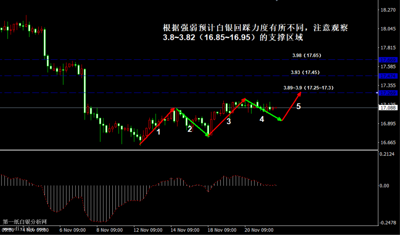 今日下方關鍵支撐3.82(16.95)、3.8(16.85)、3.72(16.5)。今日上方關鍵阻力3.89~3.9(17.2~17.3)。 提示:技術僅僅是基于概率論和統計學的一種綜合分析手段,絕非預測。所以技術分析是在考慮做好止損的情況下去博取大概率事件,投資不可過于迷信技術分析。(短線操作請一定做好止損,一旦被損,代表分析師基于概率和統計的技術分析不適用于當前行情) 另外,由于紙白銀價格是國際銀價換算而來,而換算過程中涉及到人民幣對美元匯率的變化,即使在國際銀價不變化的情況下,如果人民幣貶值或升值,也會導致紙白銀價格出現變動。因此,我們的分析只采用最新的國際銀價對應的人民幣白銀價格,如與過去分析價格有出入, 投資者應知曉其原因。 1、文中價格為紙白銀價格,括號內為國際銀價,投資者可雙向參考。 2、以上價格為工商銀行買入價,即紙白銀低價。進倉點位要再加點差(各銀行點差不一),出倉則不要。 3、第一紙白銀給出的所有建議僅供投資者參考,不作為下單依據,作者不持有白銀,也不計劃買入。觀點僅供參考,不構成投資建議,風險自擔。 4、北京時間09:00發布此文章。 5、上一交易日白銀價格分析情況:(11月21日)白銀維持緩慢震蕩上行 4浪反彈行情仍將繼續