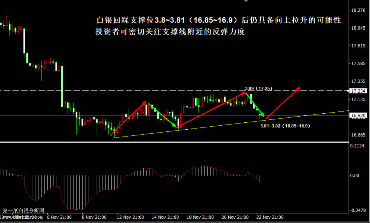今日下方關(guān)鍵支撐3.81~3.82(16.85~16.9)、3.75(16.6)、3.72(16.5)。今日上方關(guān)鍵阻力3.9(17.3)。 提示:技術(shù)僅僅是基于概率論和統(tǒng)計(jì)學(xué)的一種綜合分析手段,絕非預(yù)測。所以技術(shù)分析是在考慮做好止損的情況下去博取大概率事件,投資不可過于迷信技術(shù)分析。(短線操作請一定做好止損,一旦被損,代表分析師基于概率和統(tǒng)計(jì)的技術(shù)分析不適用于當(dāng)前行情) 另外,由于紙白銀價格是國際銀價換算而來,而換算過程中涉及到人民幣對美元匯率的變化,即使在國際銀價不變化的情況下,如果人民幣貶值或升值,也會導(dǎo)致紙白銀價格出現(xiàn)變動。因此,我們的分析只采用最新的國際銀價對應(yīng)的人民幣白銀價格,如與過去分析價格有出入, 投資者應(yīng)知曉其原因。 1、文中價格為紙白銀價格,括號內(nèi)為國際銀價,投資者可雙向參考。 2、以上價格為工商銀行買入價,即紙白銀低價。進(jìn)倉點(diǎn)位要再加點(diǎn)差(各銀行點(diǎn)差不一),出倉則不要。 3、第一紙白銀給出的所有建議僅供投資者參考,不作為下單依據(jù),作者不持有白銀,也不計(jì)劃買入。觀點(diǎn)僅供參考,不構(gòu)成投資建議,風(fēng)險(xiǎn)自擔(dān)。 4、北京時間09:00發(fā)布此文章。 5、上一交易日白銀價格分析情況:(11月22日)白銀短線或先回踩支撐 而后走勢仍有反彈預(yù)期
